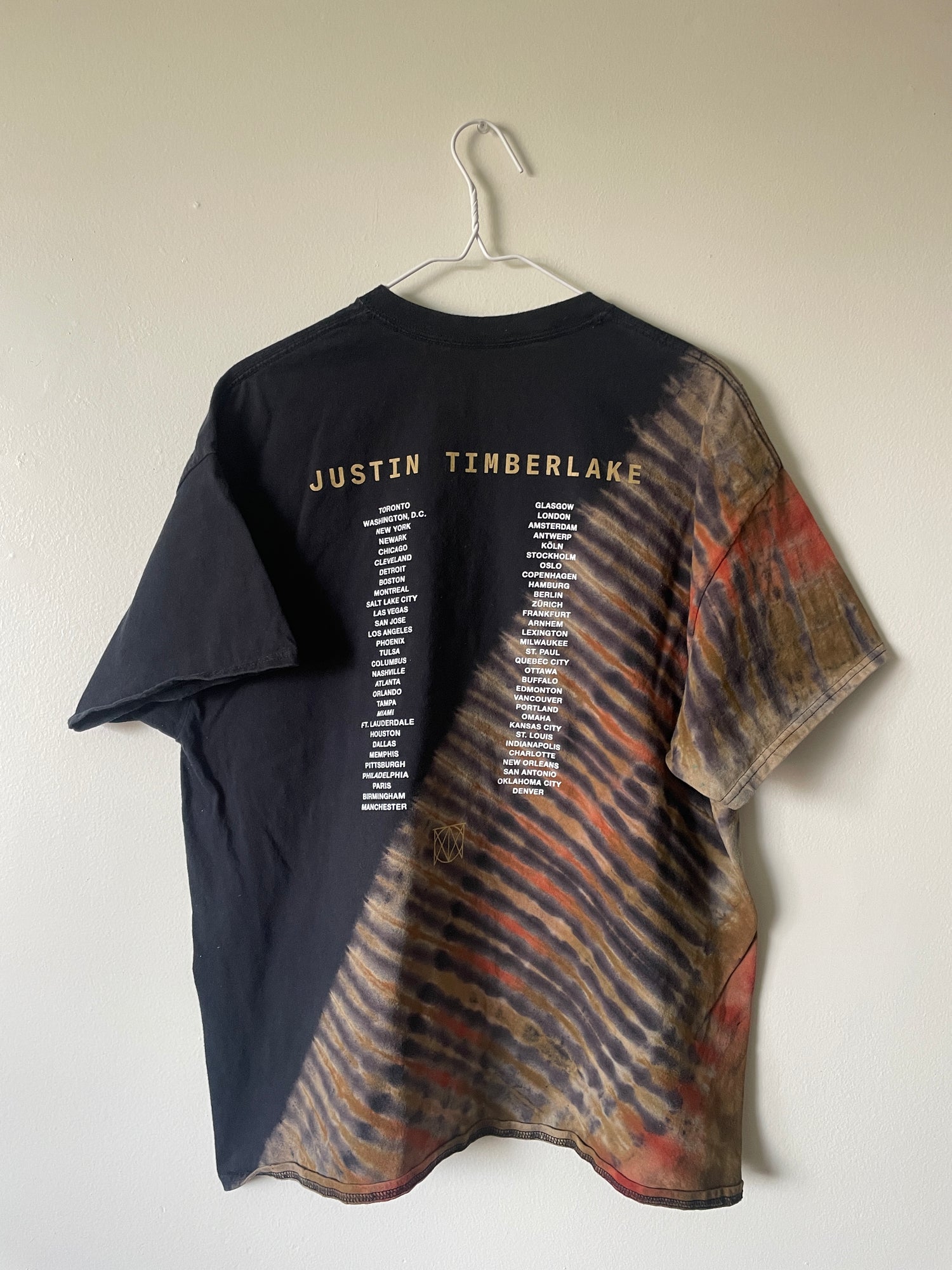 Justin Timberlake Man of the Woods 2018 Tour Handmade Tie Dye Short Sleeve T-Shirt | One-Of-a-Kind Upcycled Black, Tan, and Orange Pleated Top | Men's XL