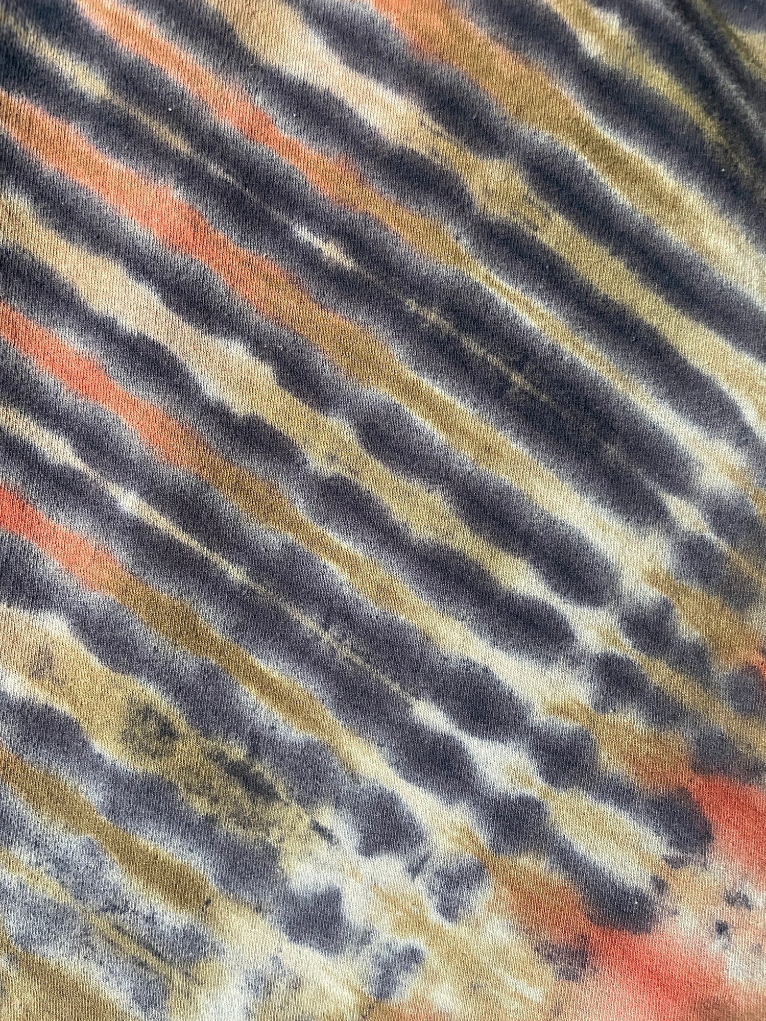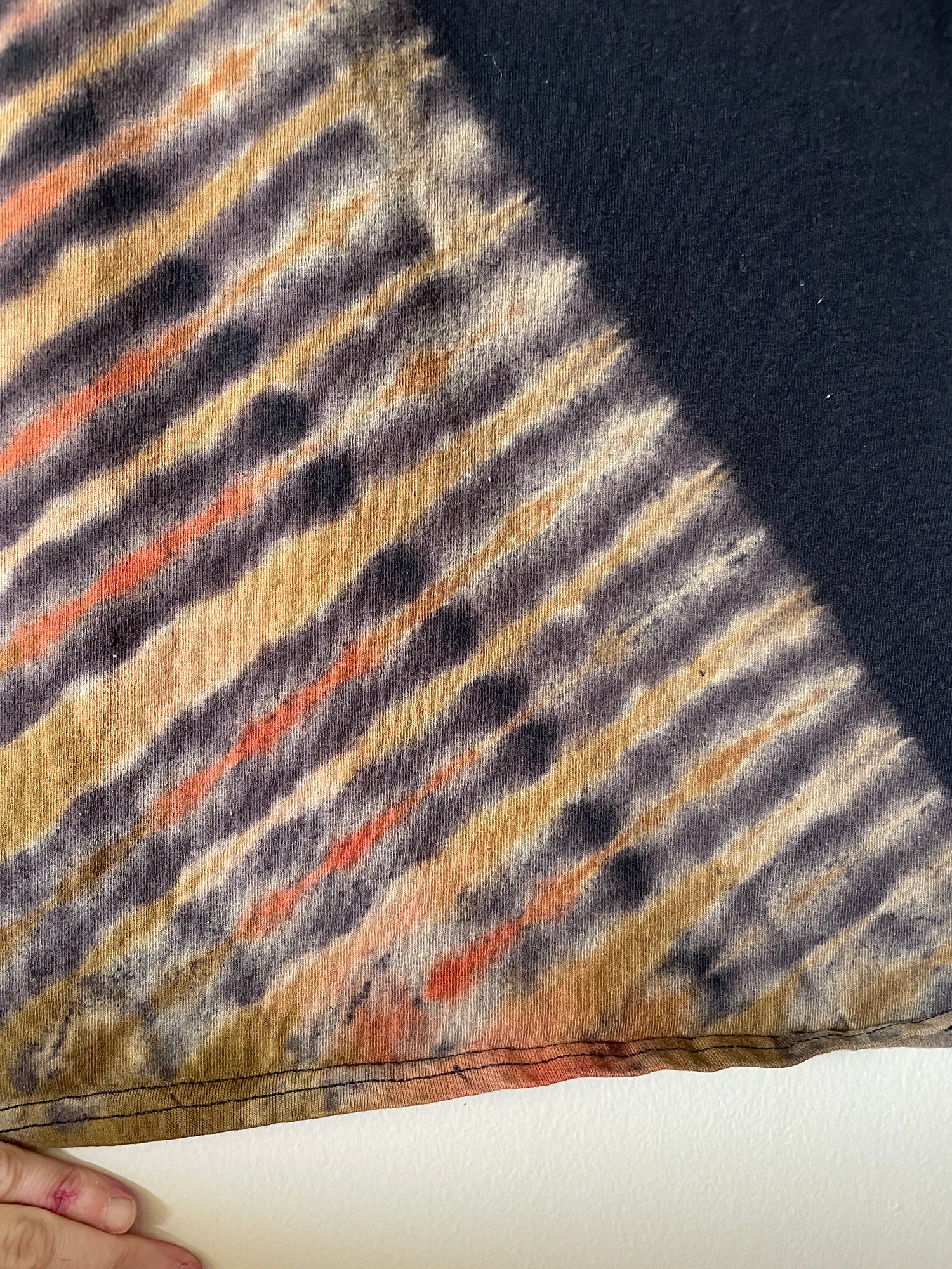 black tshirt bleached and dyed with shades of tan, orange, and brown pleated tie dye pattern