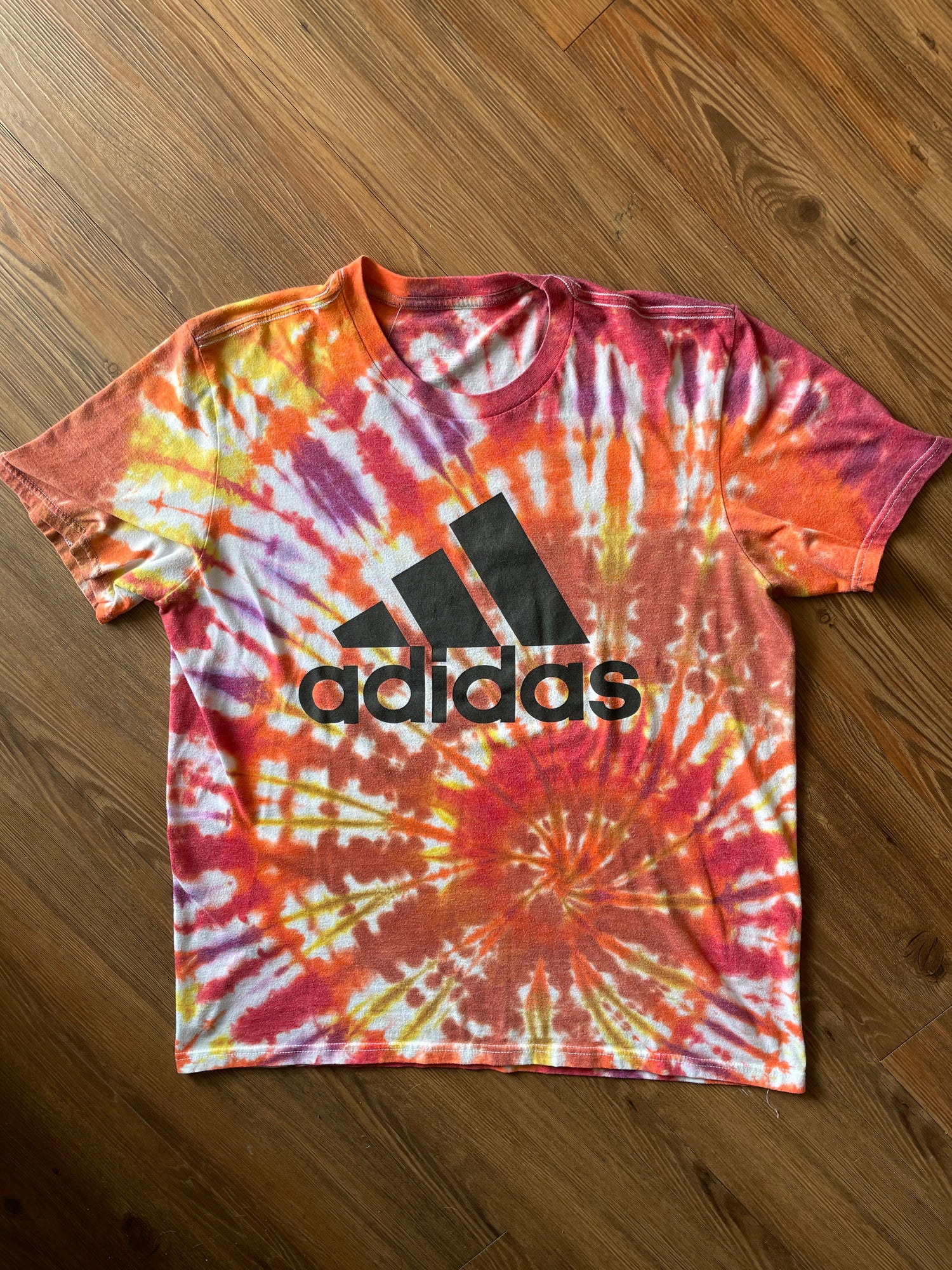 LARGE Men’s adidas Three Stripes Handmade Tie Dye T-Shirt | One-Of-a-Kind Orange, Red, and Yellow SpiralShort Sleeve