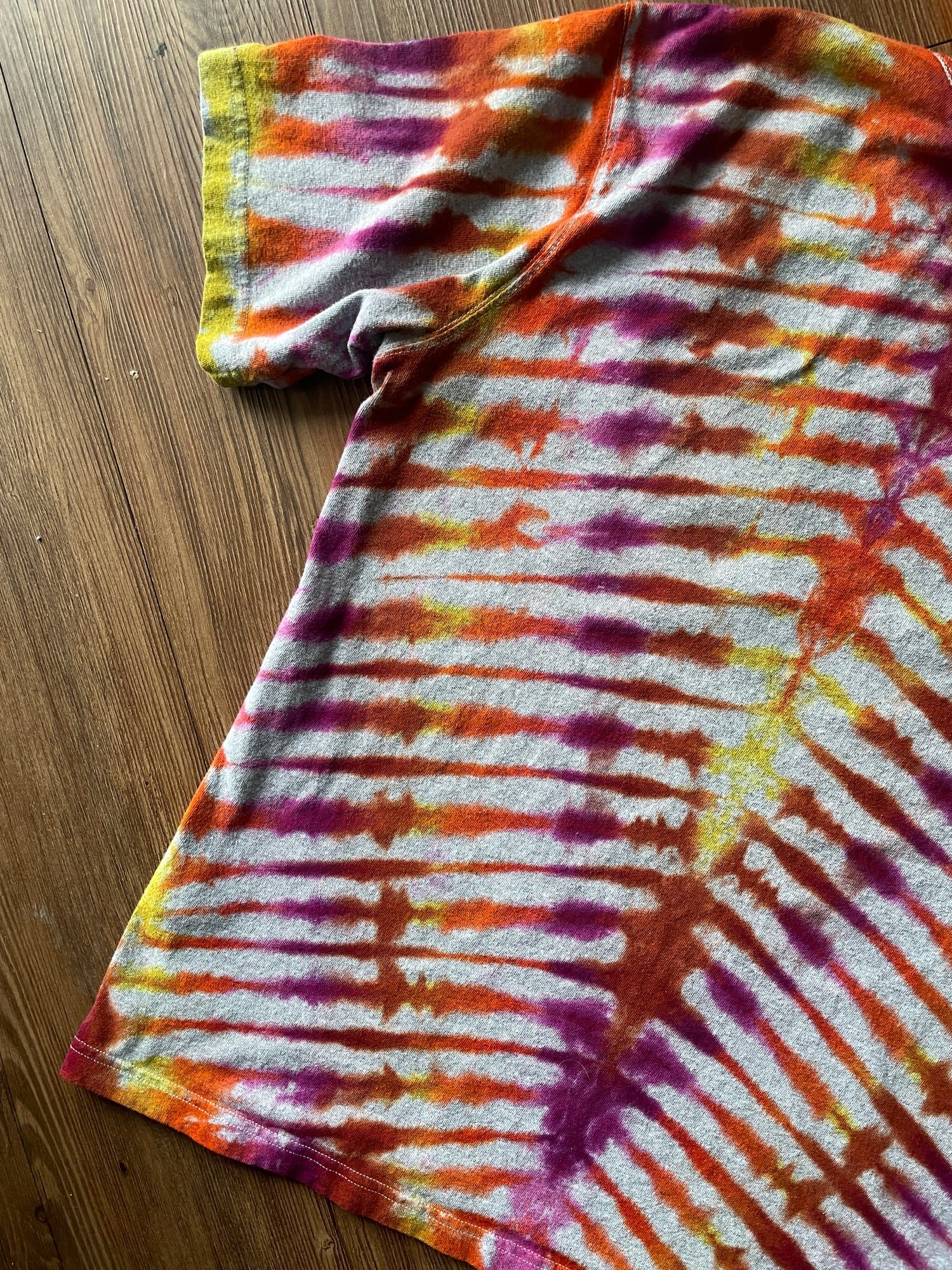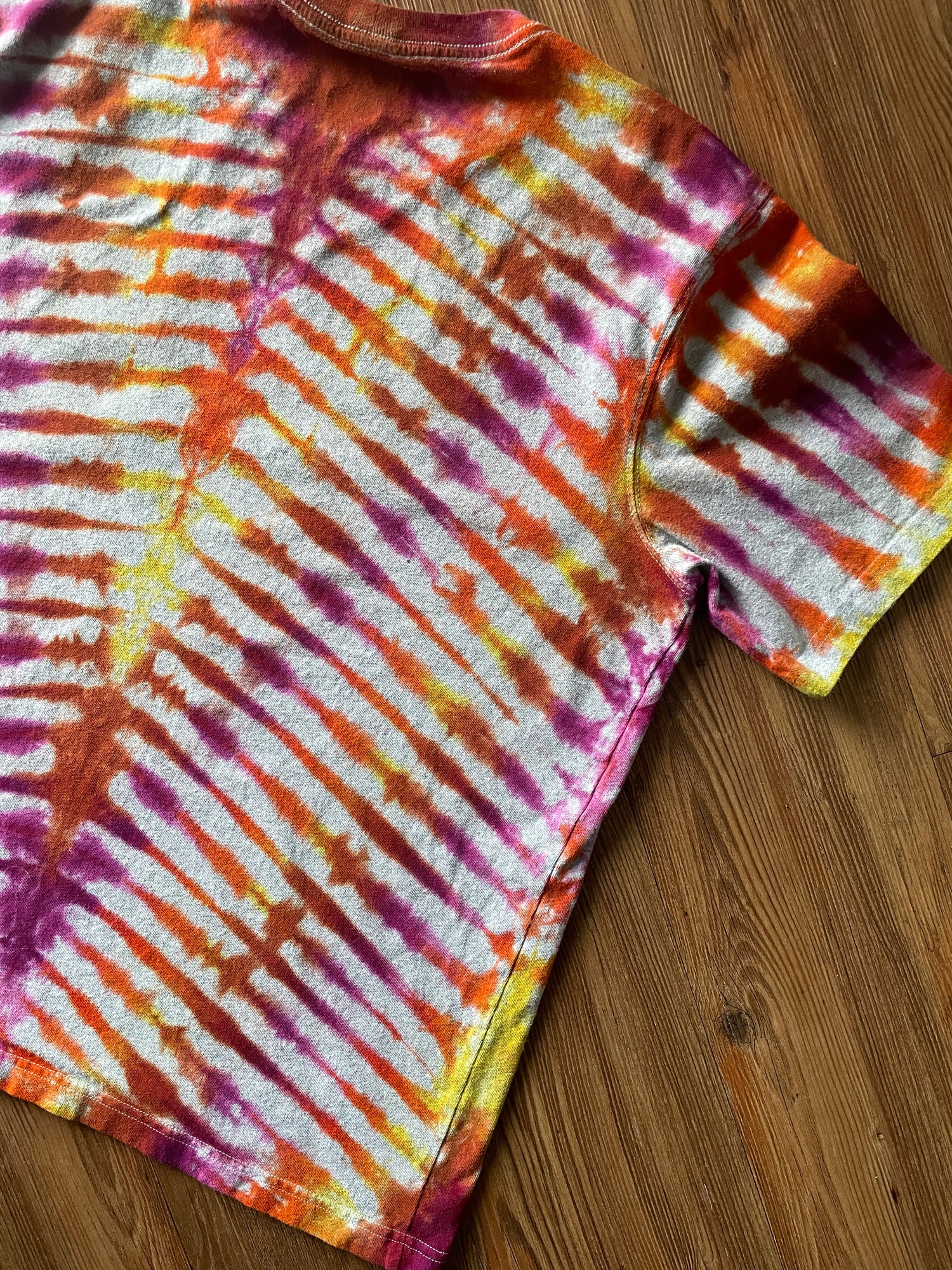 gray tshirt dyed with orange, pink, and yellow v-pleated tie dye pattern
