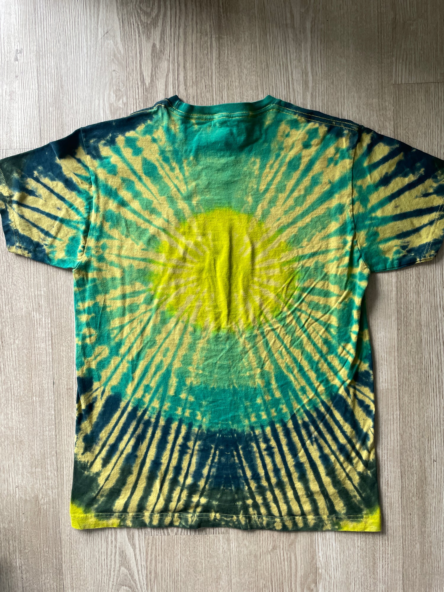 LARGE Men’s Climbing Shoe Handmade Tie Dyed T-Shirt | One-Of-a-Kind Yellow, Blue, and Green Pleated Short Sleeve