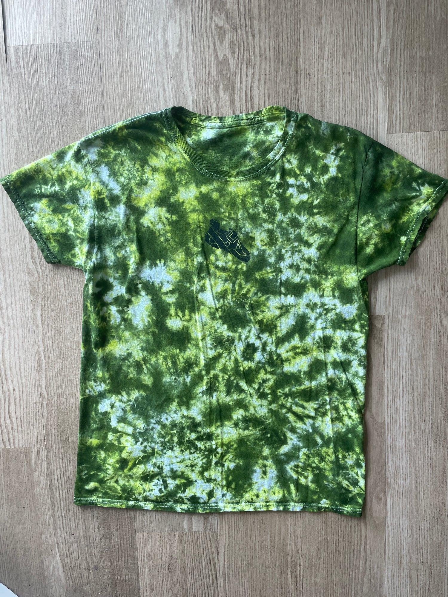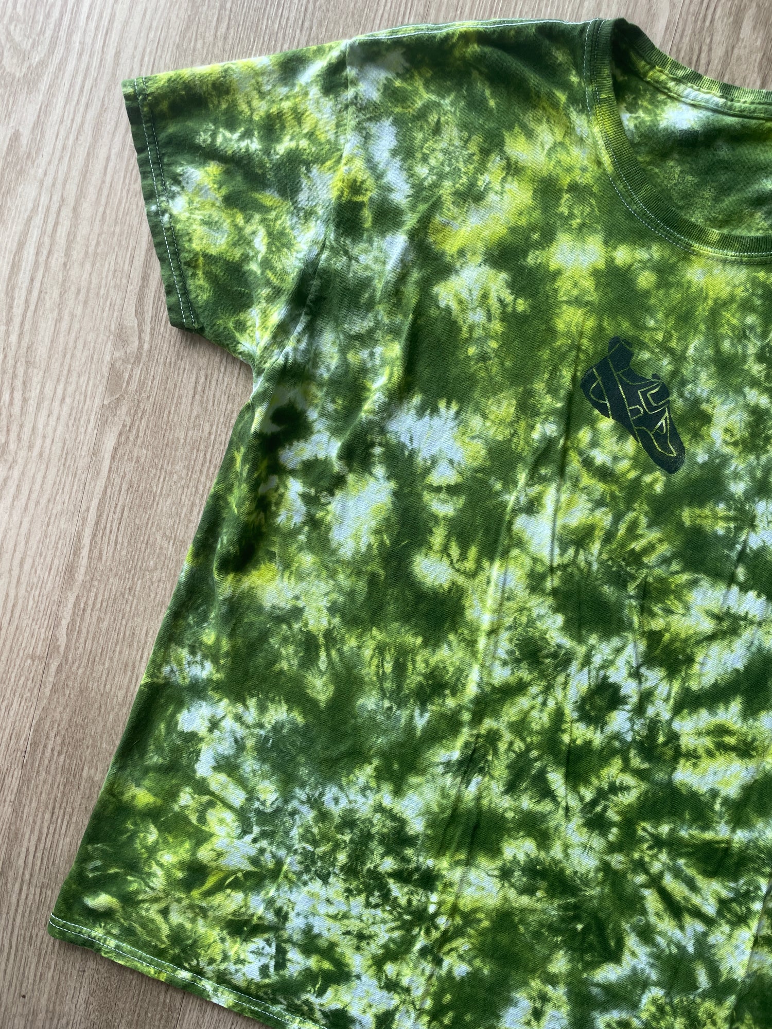 Large Men’s Climbing Shoe Tie Dye T-Shirt | One-Of-a-Kind Green and White Crumpled Short Sleeve