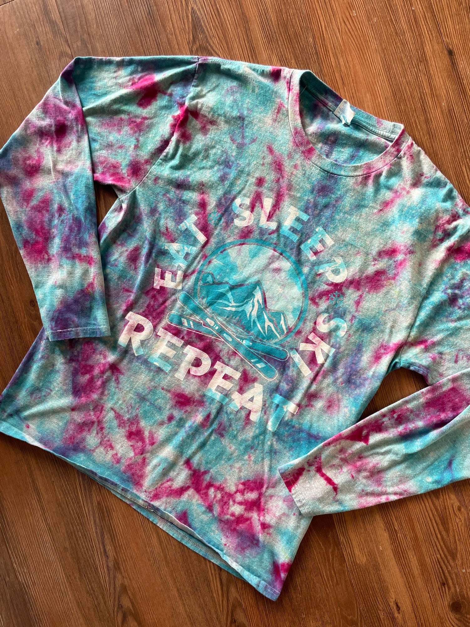 LARGE Men’s Eat, Sleep, Ski, Repeat Galaxy Handmade Tie Dye Long Sleeve T-Short | Pastel Blue and Purple Ice Dye Long Sleeve Tee