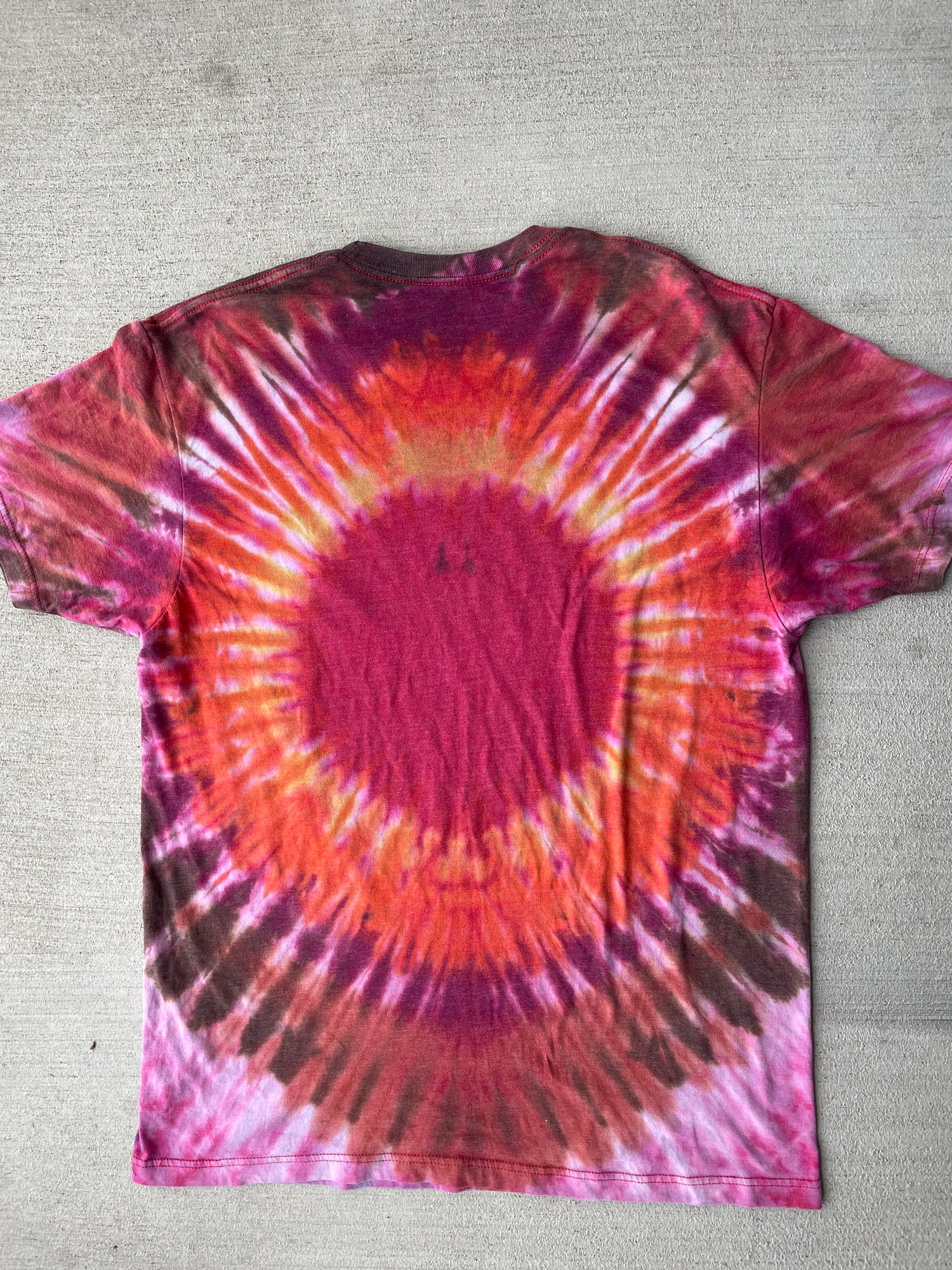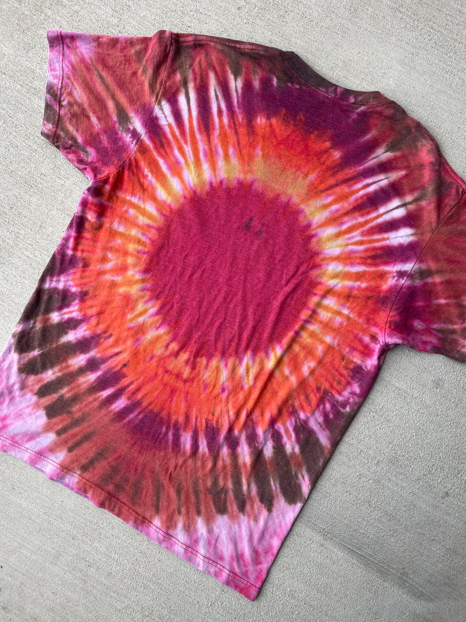 red tshirt dyed with orange, yellow, and pink tie dye pattern