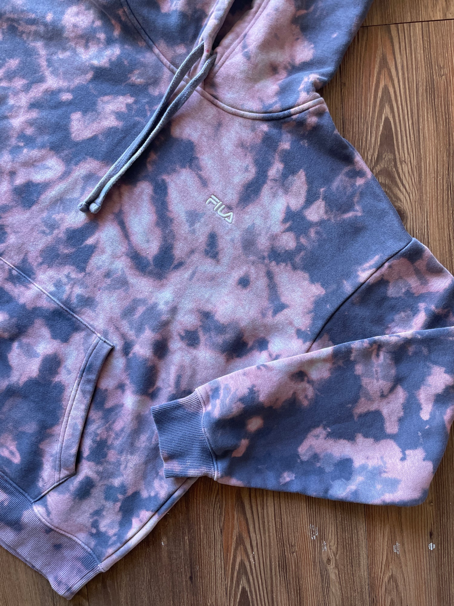 LARGE Men’s Handmade Fila Tie Dye Hoodie | One-Of-a-Kind Pastel Purple and Gray Long Sleeve Sweatshirt