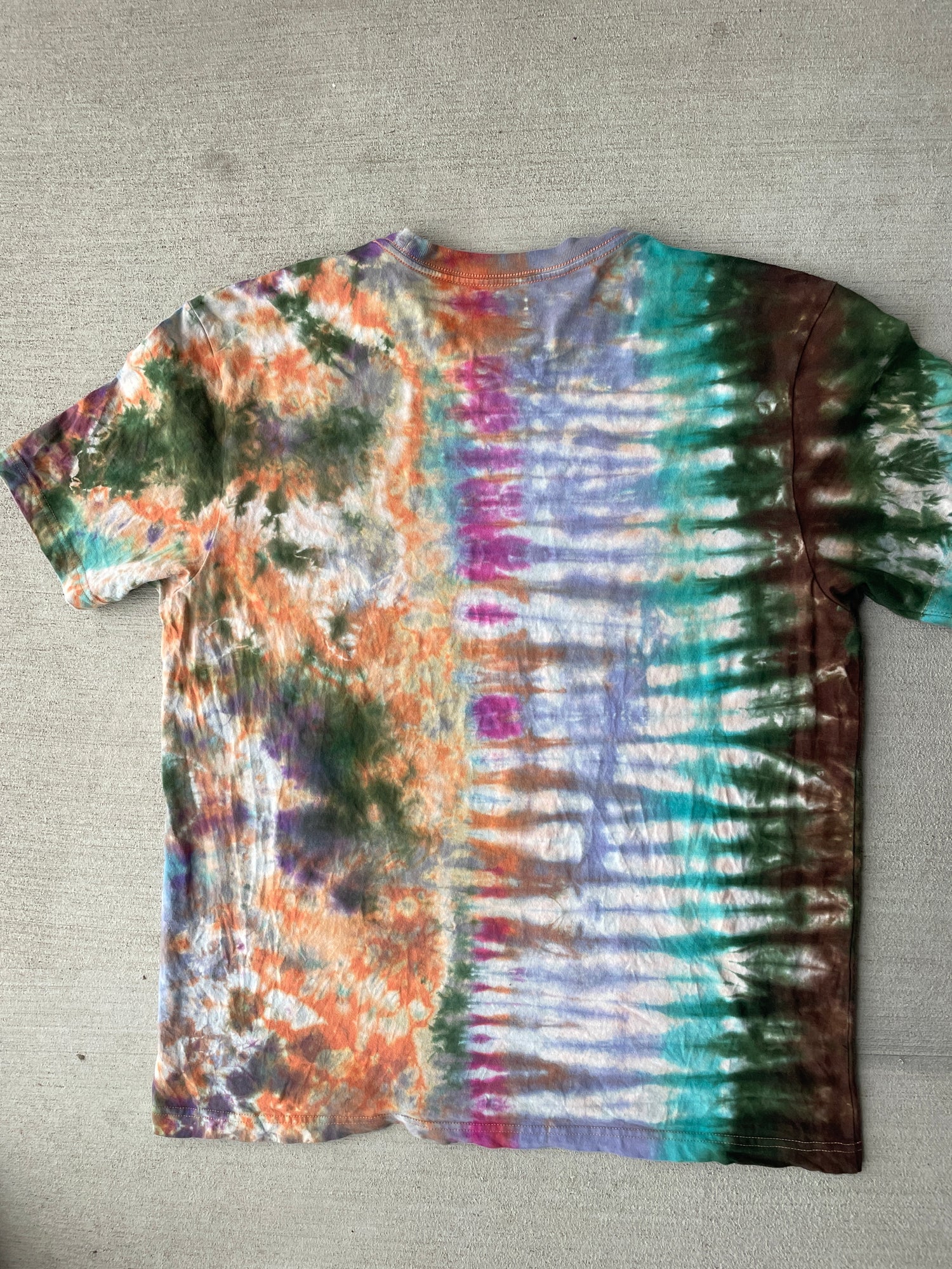 formerly orange tshirt dyed with brown, green, and purple pleated and crumple tie dye pattern
