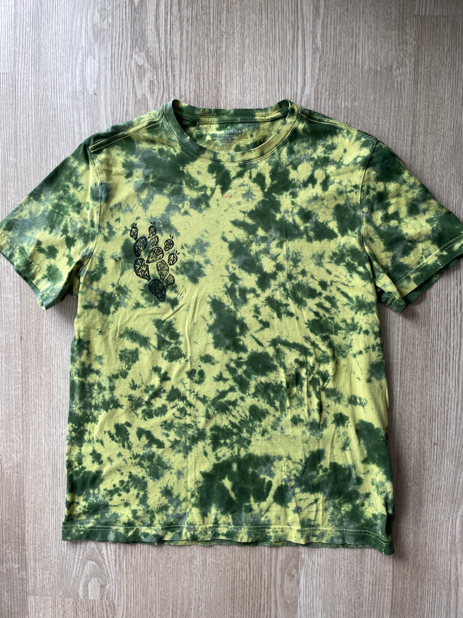 LARGE Men’s Prickly Pear Cactus Tie Dye T-Shirt | One-Of-a-Kind Yellow and Green Crumpled Short Sleeve