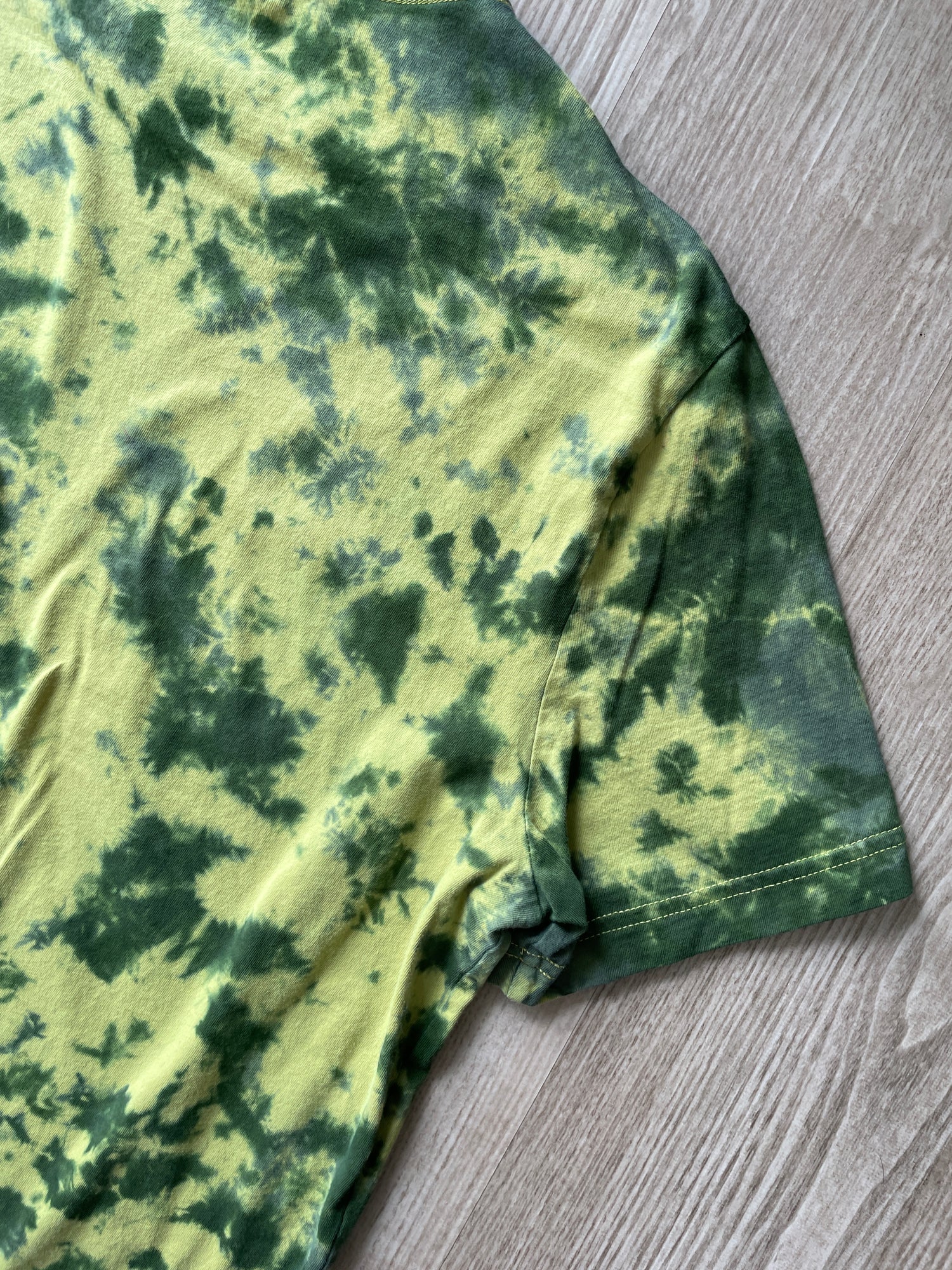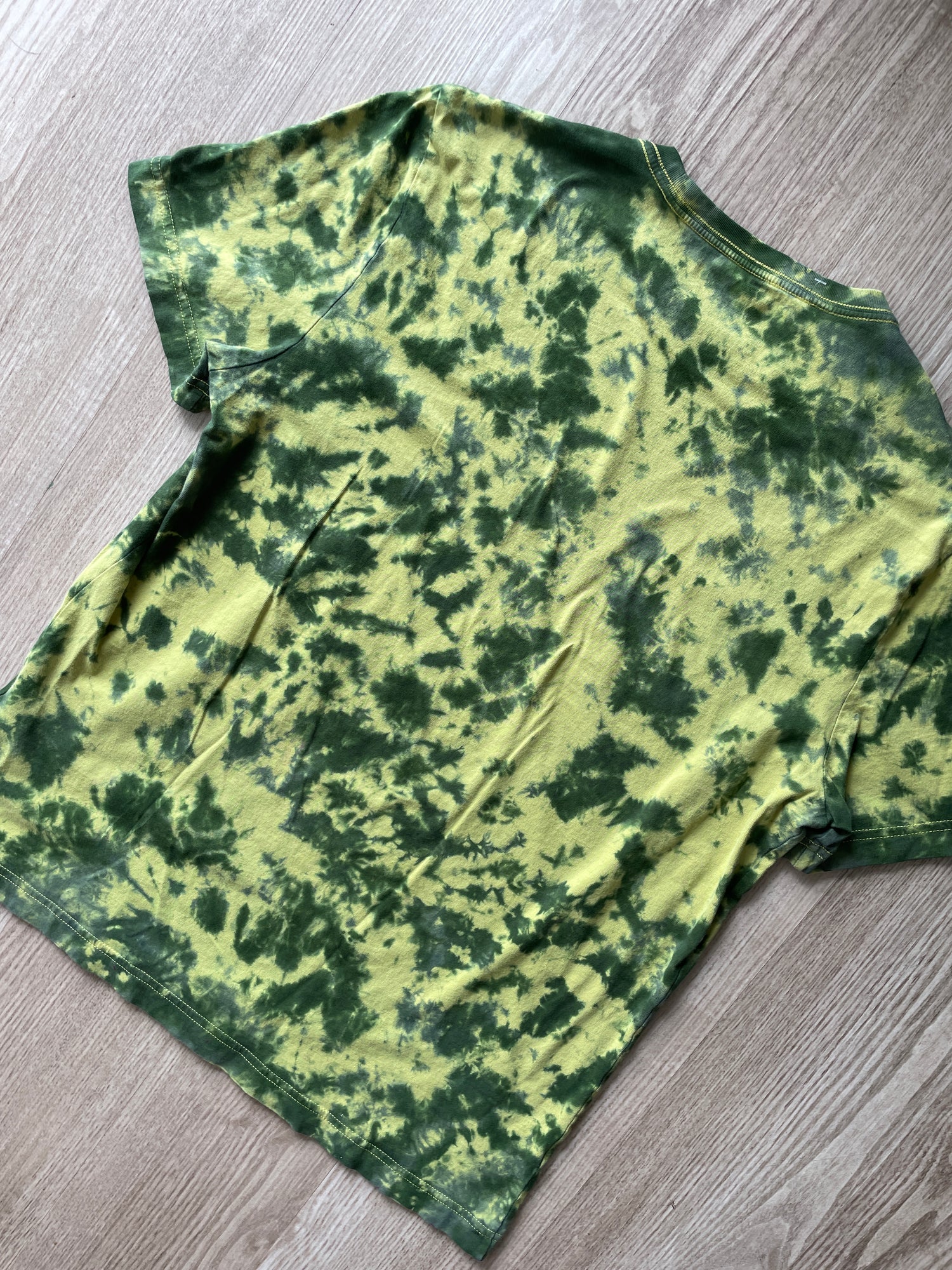 yellow tshirt dyed with shades of green crumpled tie dye pattern