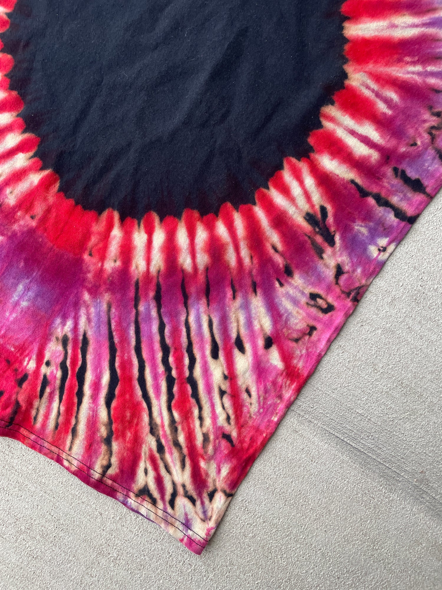 black tshirt dyed with red and pink circle pleated tie dye pattern