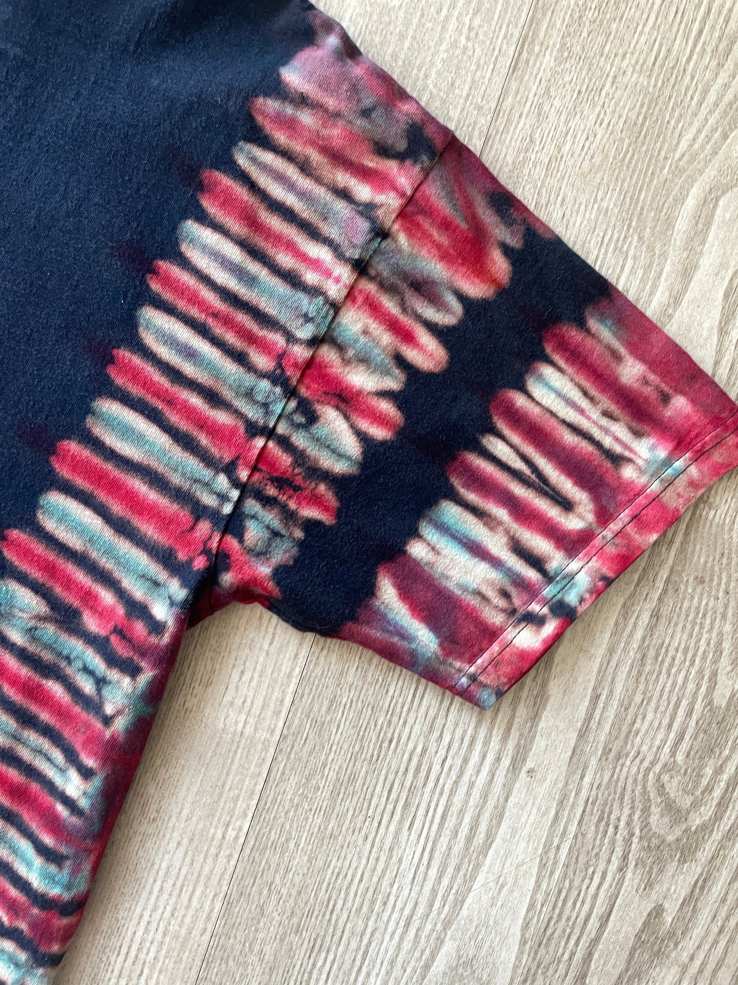 black tshirt bleached and dyed with blue and red pleated tie dye pattern