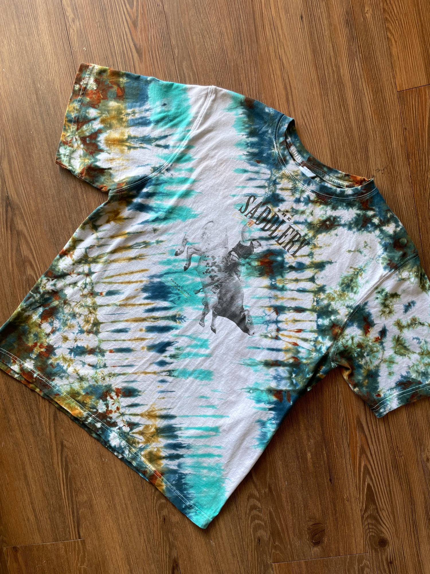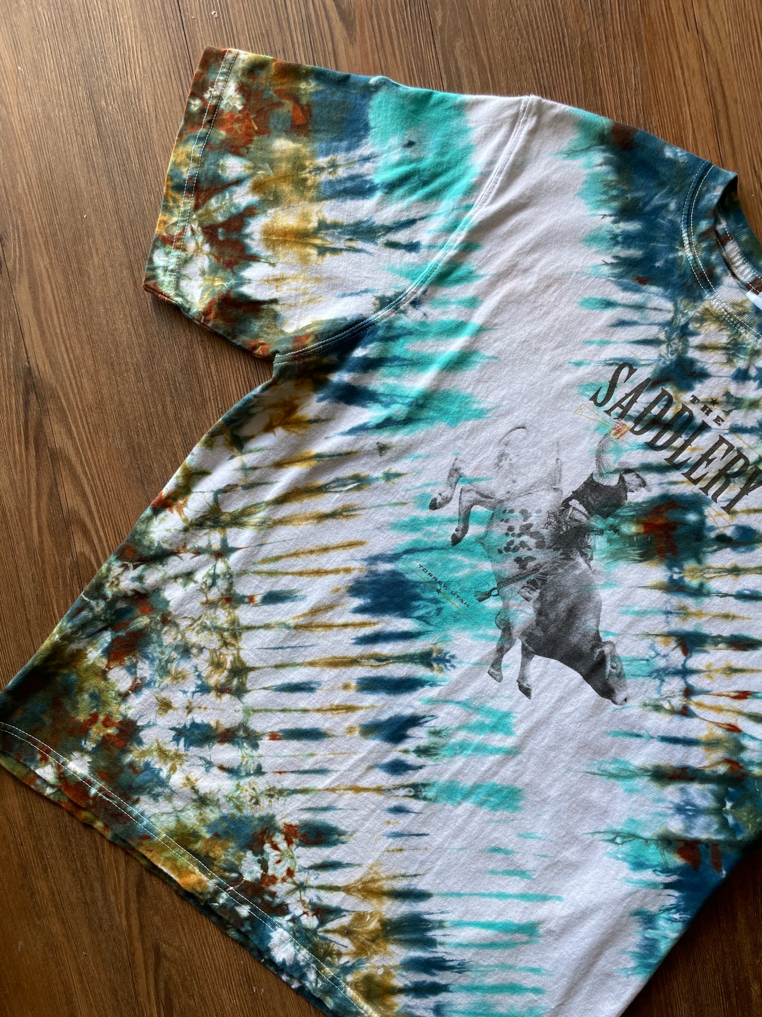 LARGE Men’s The Saddlery Bullrider Handmade Tie Dye T-Shirt | One-Of-a-Kind White, Blue, Green, and Brown Short Sleeve