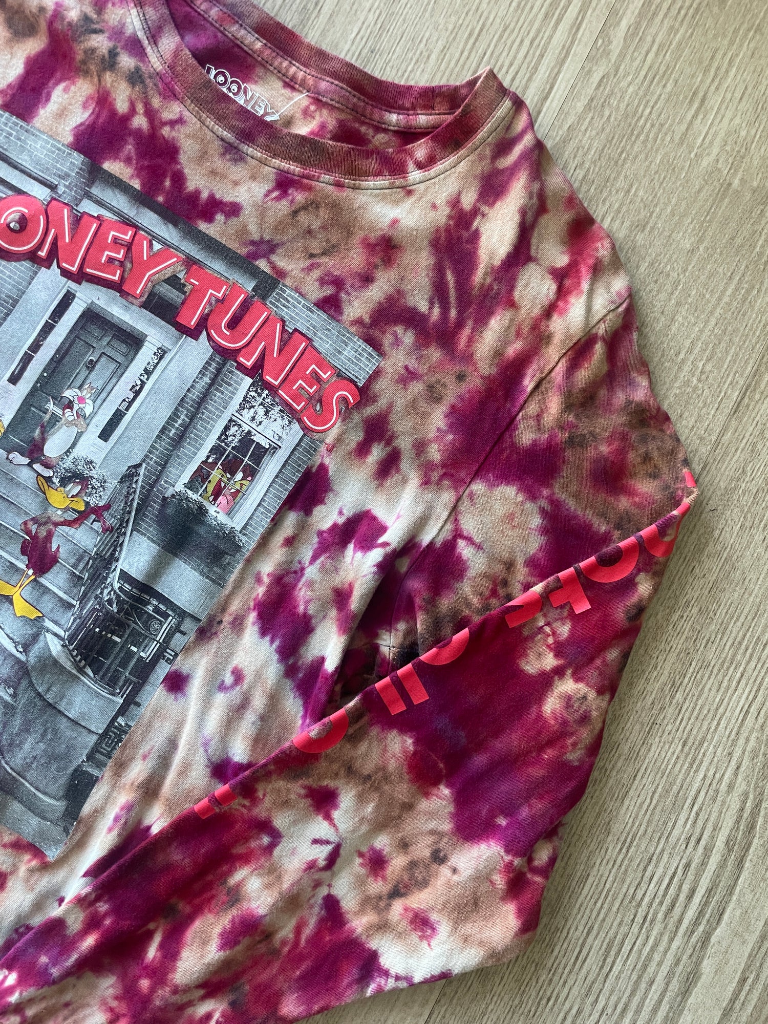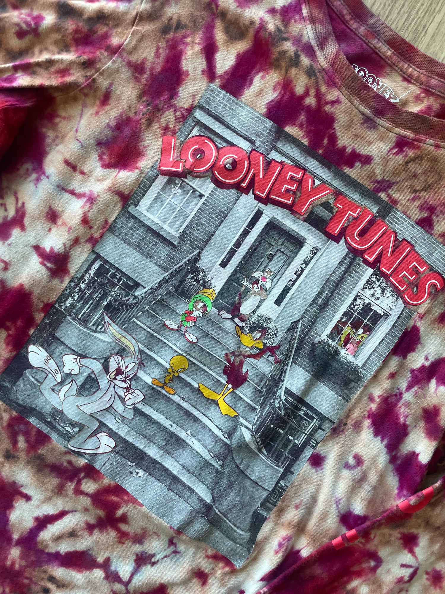 LARGE Men's Looney Tunes Front Stoop Handmade Reverse Tie Dye Long Sleeve Sleeve T-Shirt | One-Of-a-Kind Upcycled Black and Red Crumpled Top