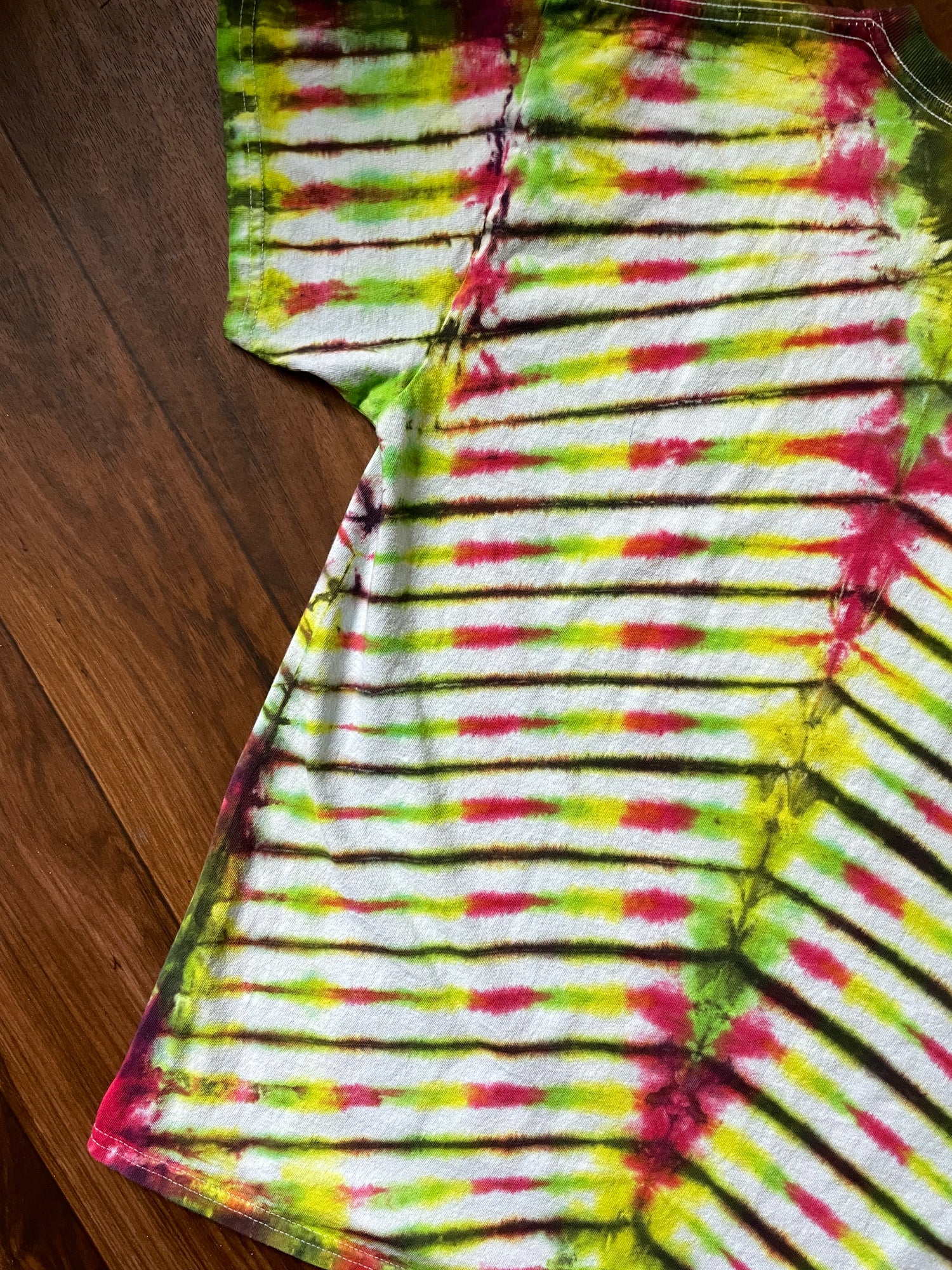 white tshirt dyed with red, green, and yellow v-pleated tie dye pattern