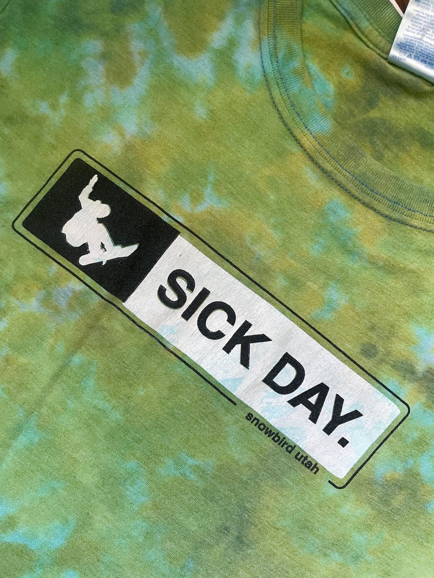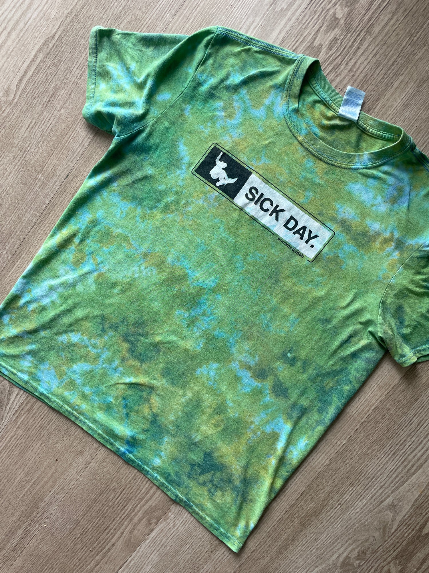 Large Men's Sick Day Snowboarding Handmade Reverse Tie Dye Short Sleeve T-Shirt | One-Of-a-Kind Upcycled Green Crumpled Top