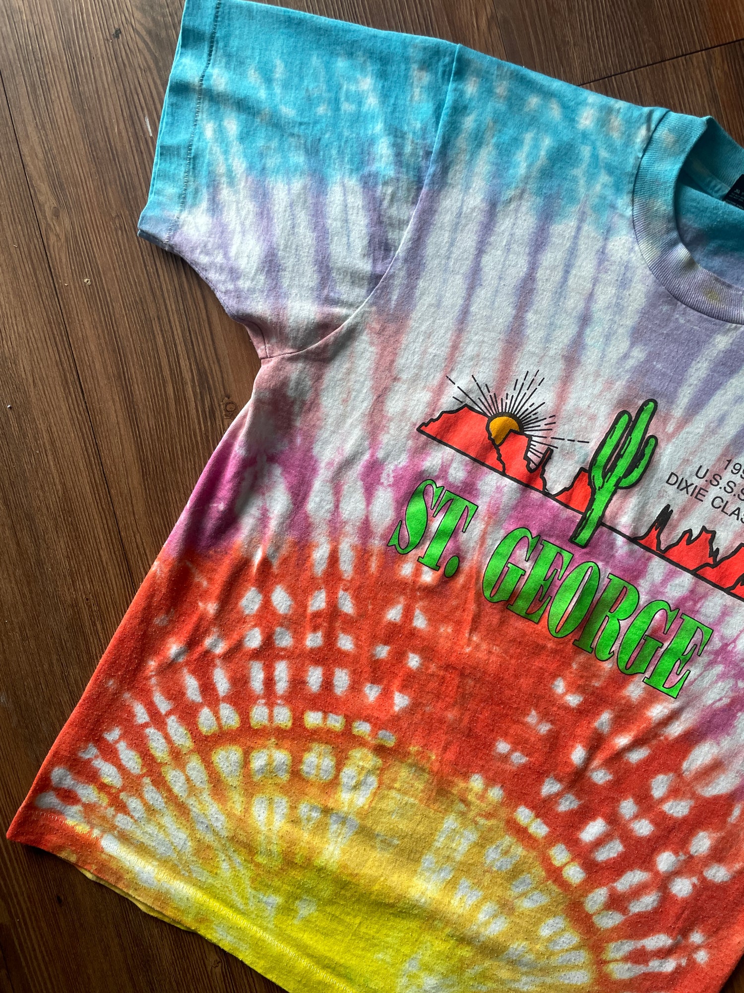 LARGE Vintage 1990 USSSA Dixie Classic Handmade Tie Dye T-Shirt | One-Of-a-Kind Sunrise Pleated Saint George, Utah Short Sleeve