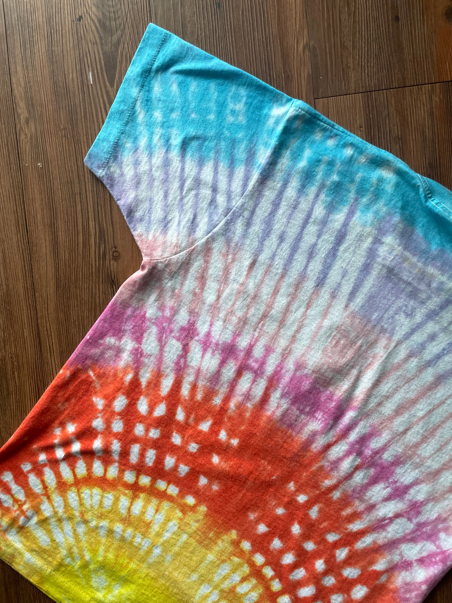 white tshirt dyed with multicolor pleated tie dye pattern arranged to resemble a sunrise