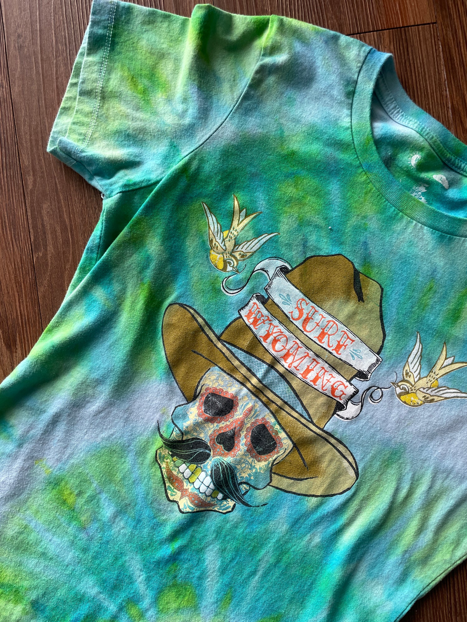 LARGE Women’s Surf Wyoming Dias de Los Muertos Sundance Kid Sugar Skull Handmade Tie Dye T-Shirt | One-Of-a-Kind Pastel Green and Blue Spiral Short Sleeve