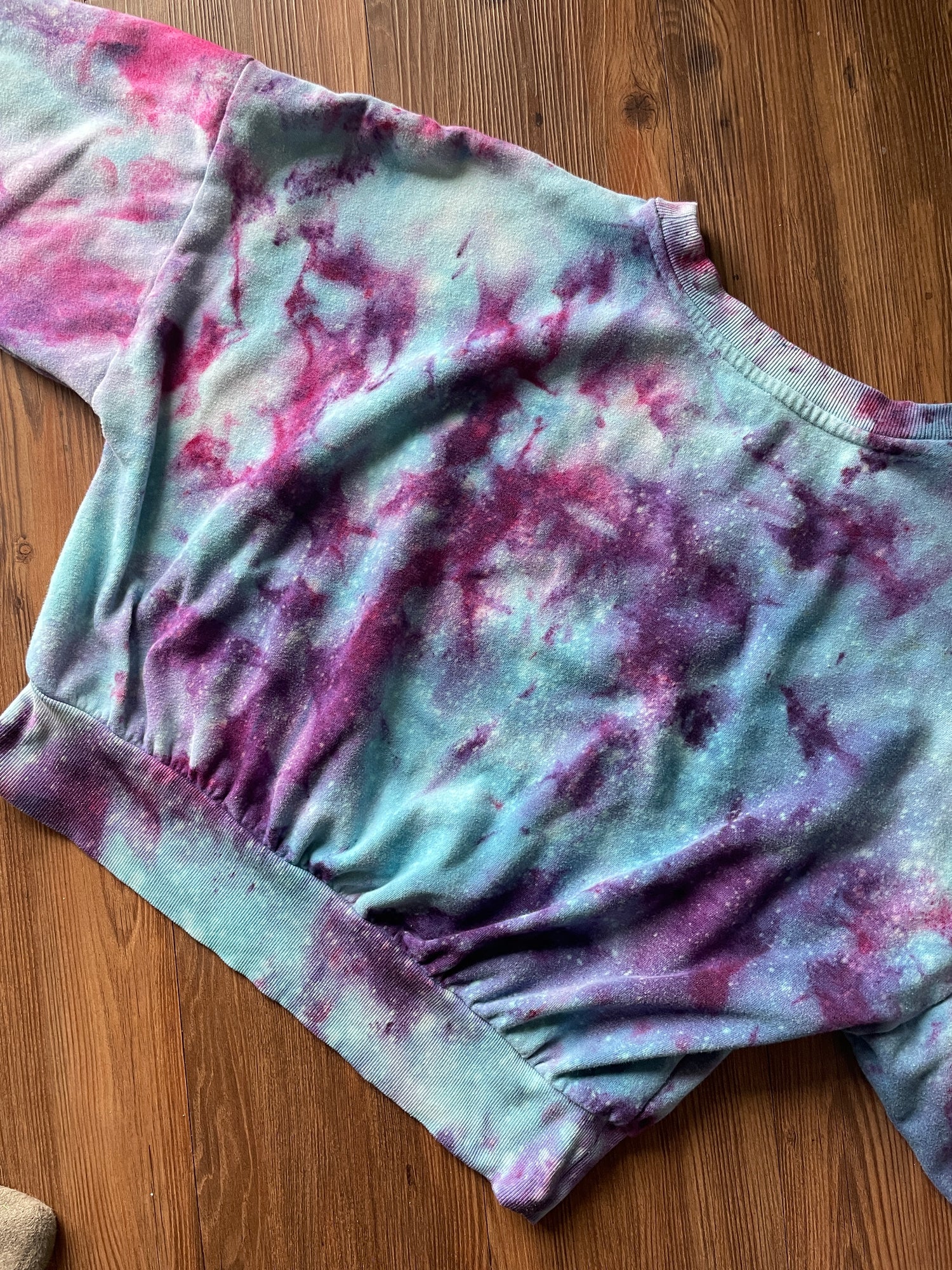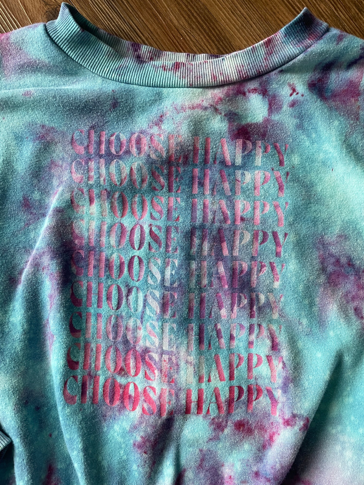 Large Women's Choose Happy Handmade Tie Dye Cropped Sweatshirt | Purple and Pink Galaxy Ice Dye Tie Dye Sweatshirt