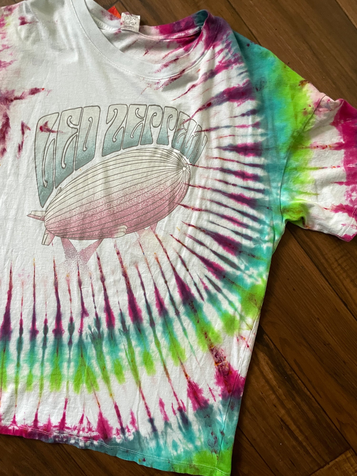 M/L Men's Led Zeppelin Mother Ship Handmade Tie Dye Short Sleeve T-Shirt | One-Of-a-Kind Upcycled Pink and Green Pleated Tie Dye Top