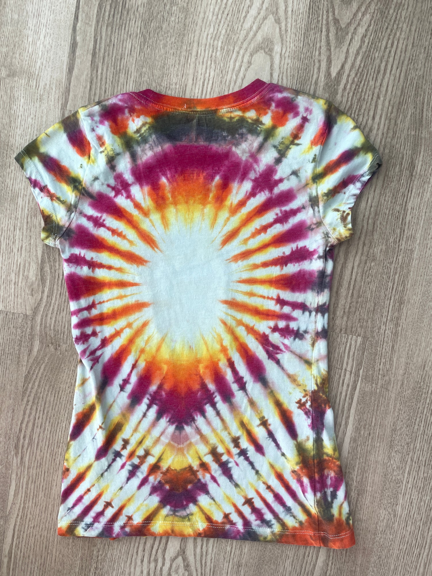 tan tshirt bleached and dyed with red and orange pleated tie dye pattern