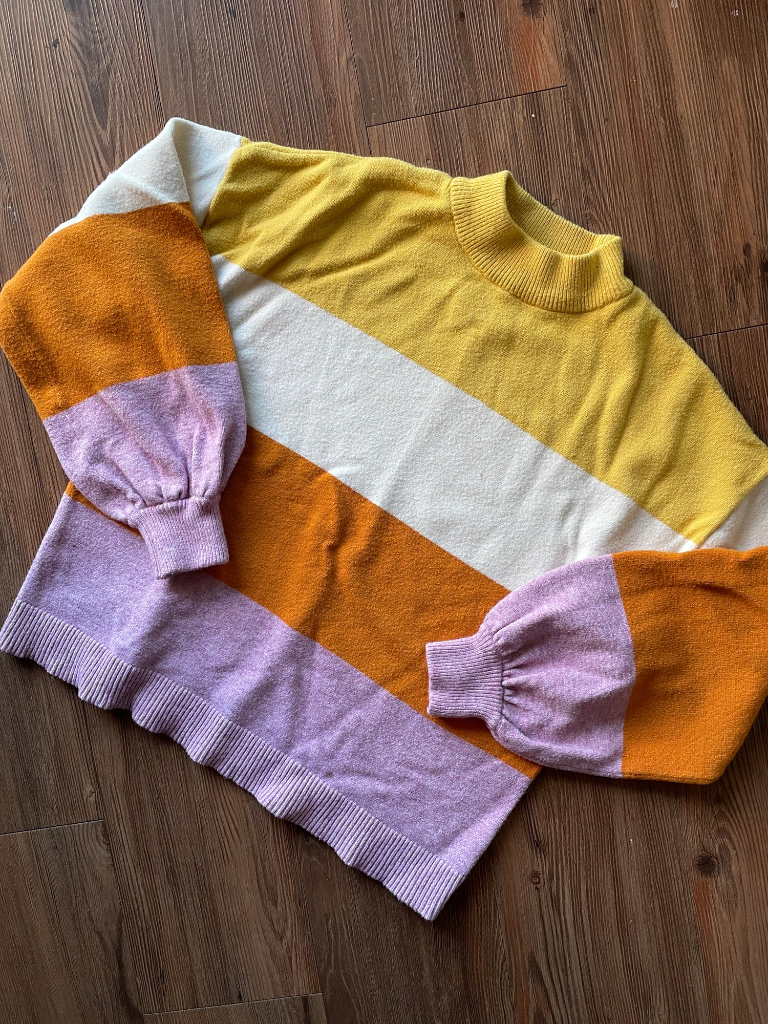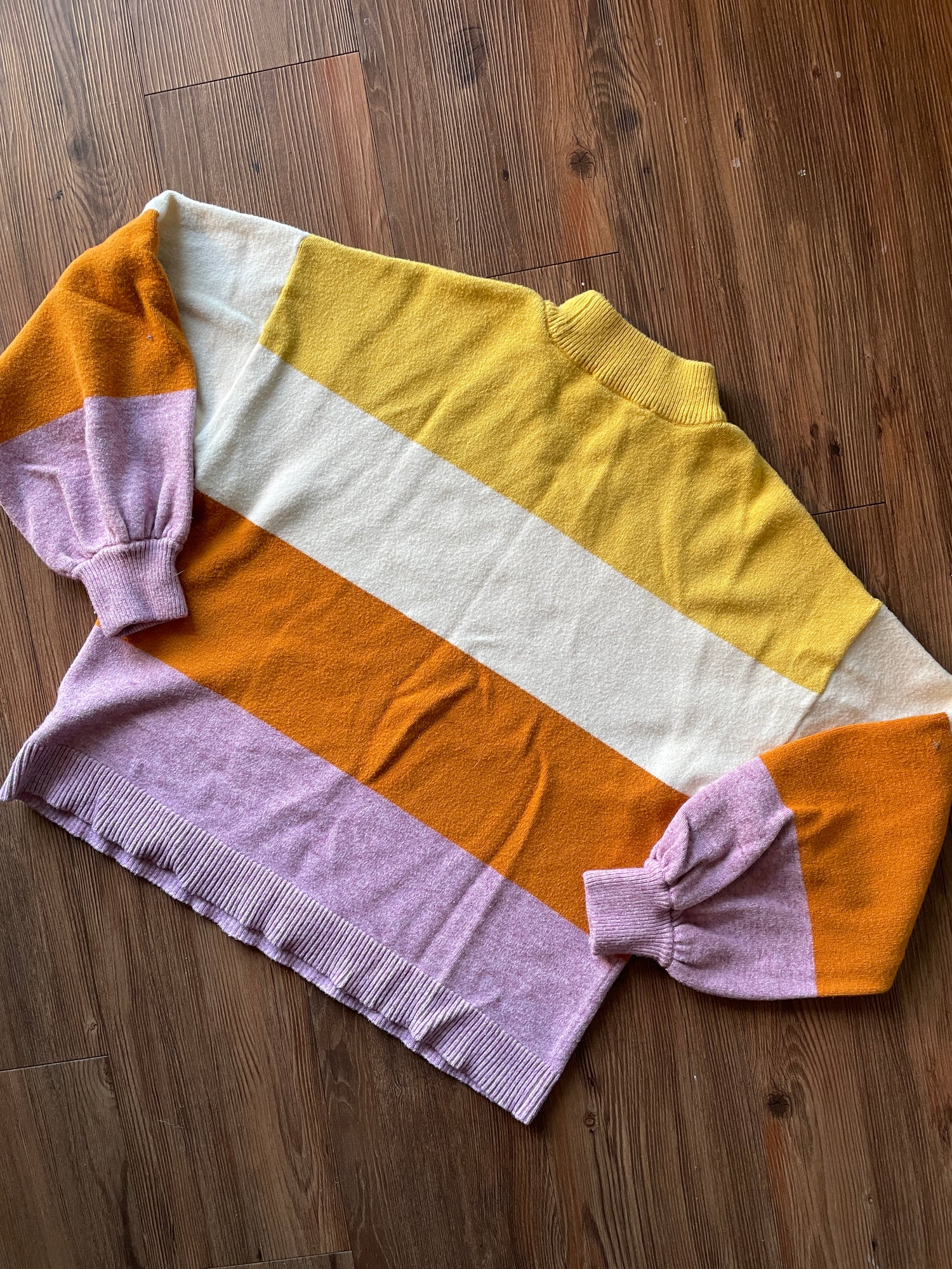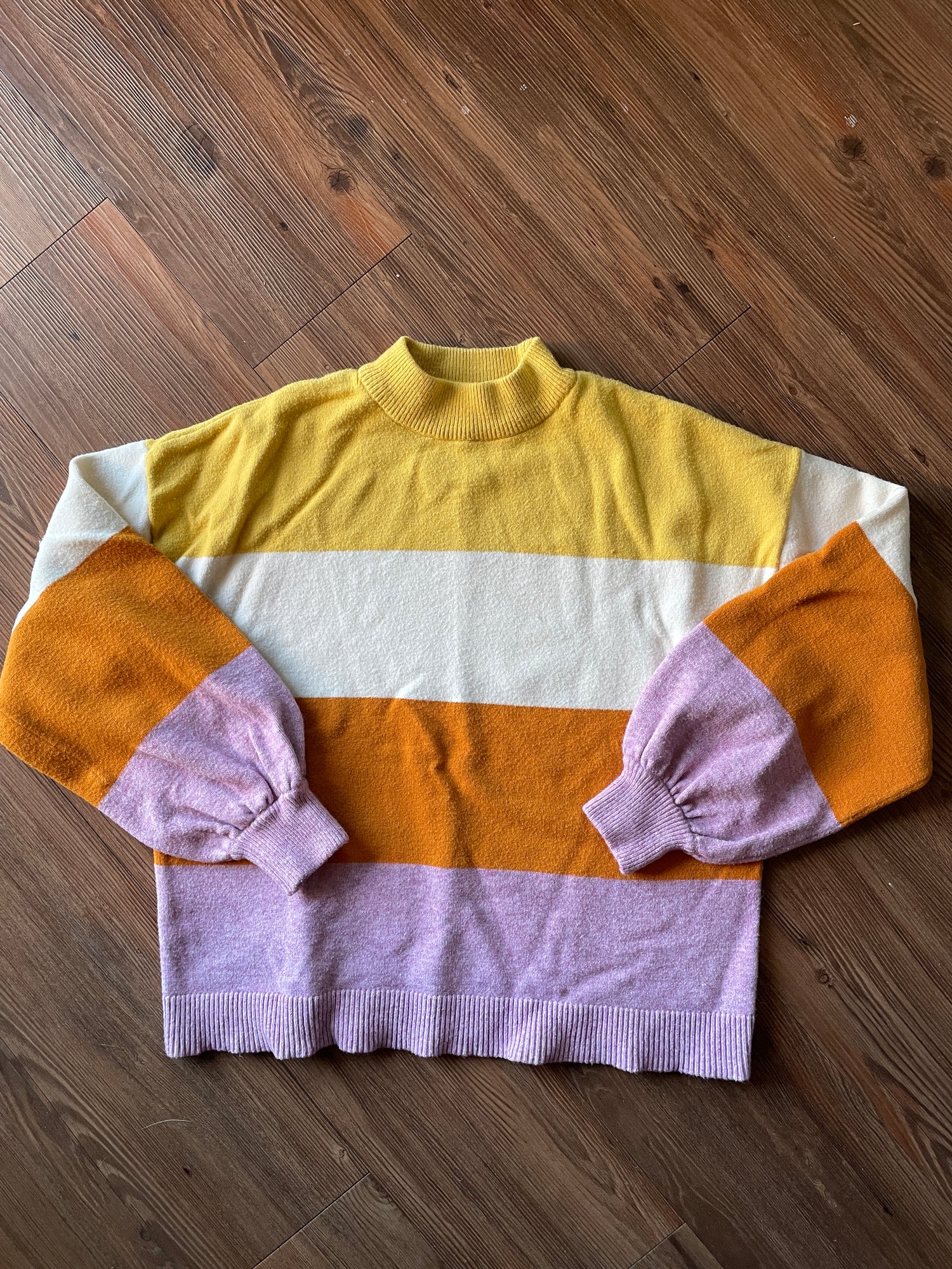 Fun floral print sweater from Nordstrom circa 2019. Sugar + Lips brand. Thick orange, white, yellow, and pink stripes combine with a mockneck and long puff sleeves for a sophisticated yet playful look. Slightly oversized fit goes great with leggings or jeans.
