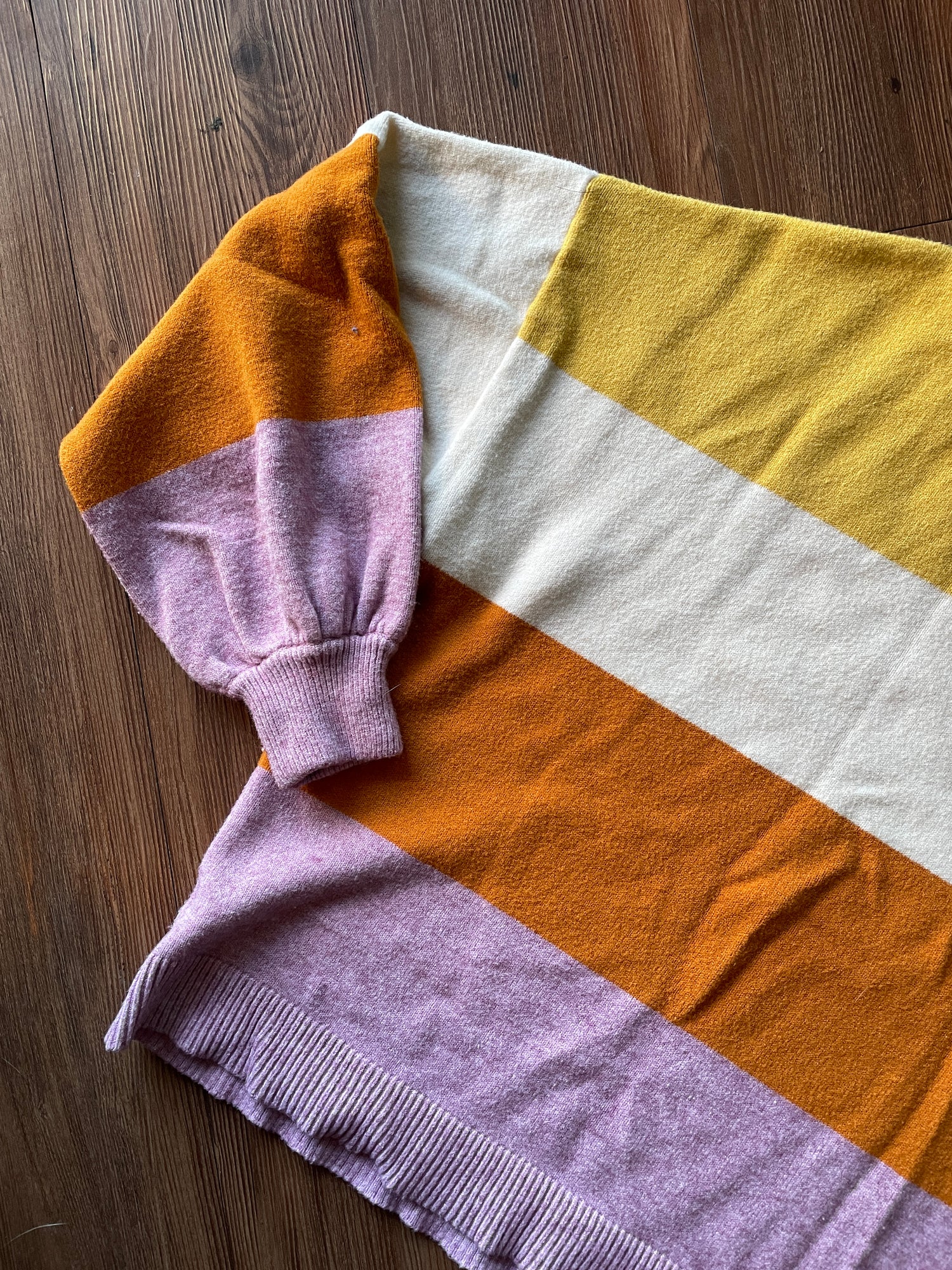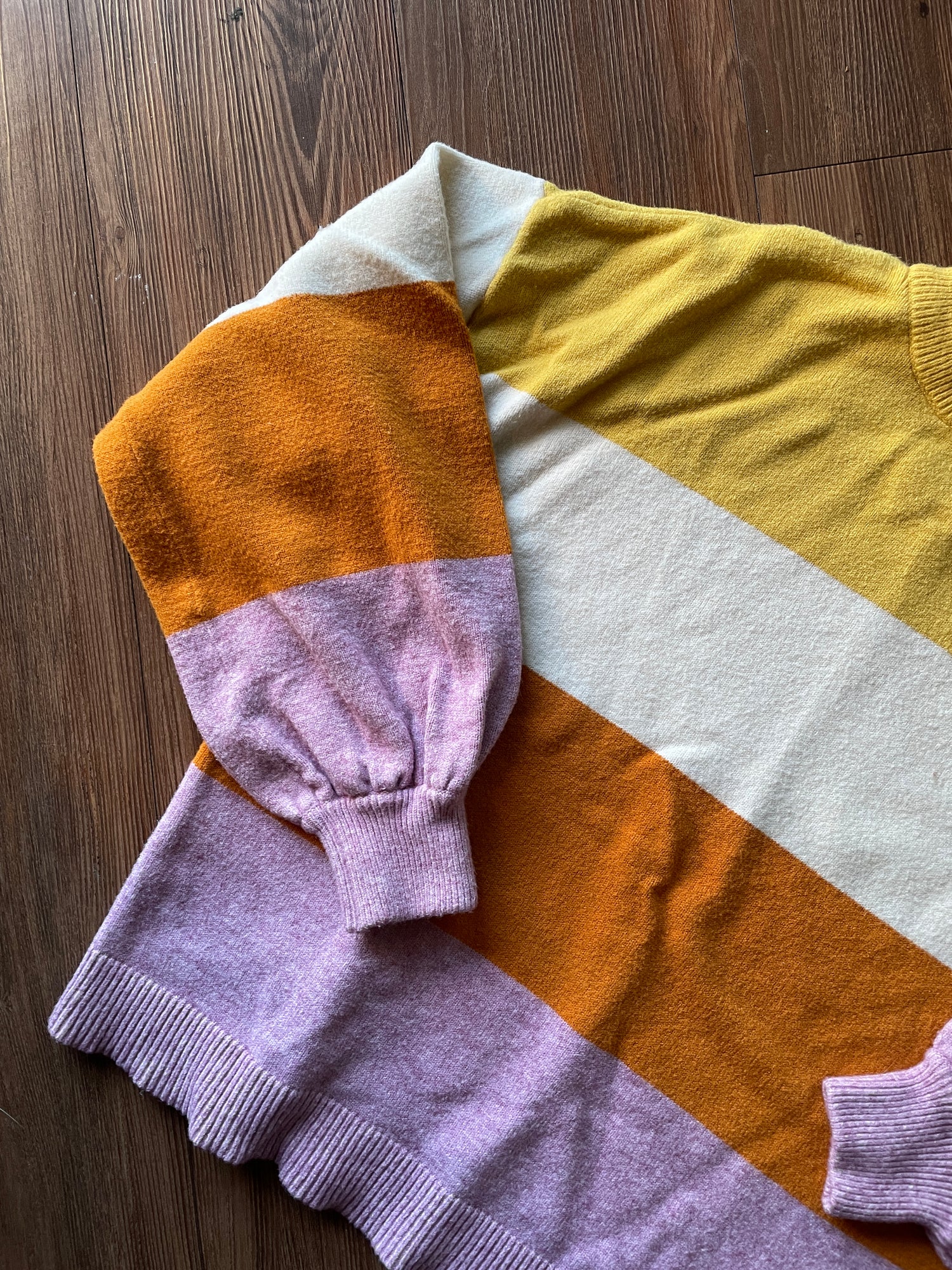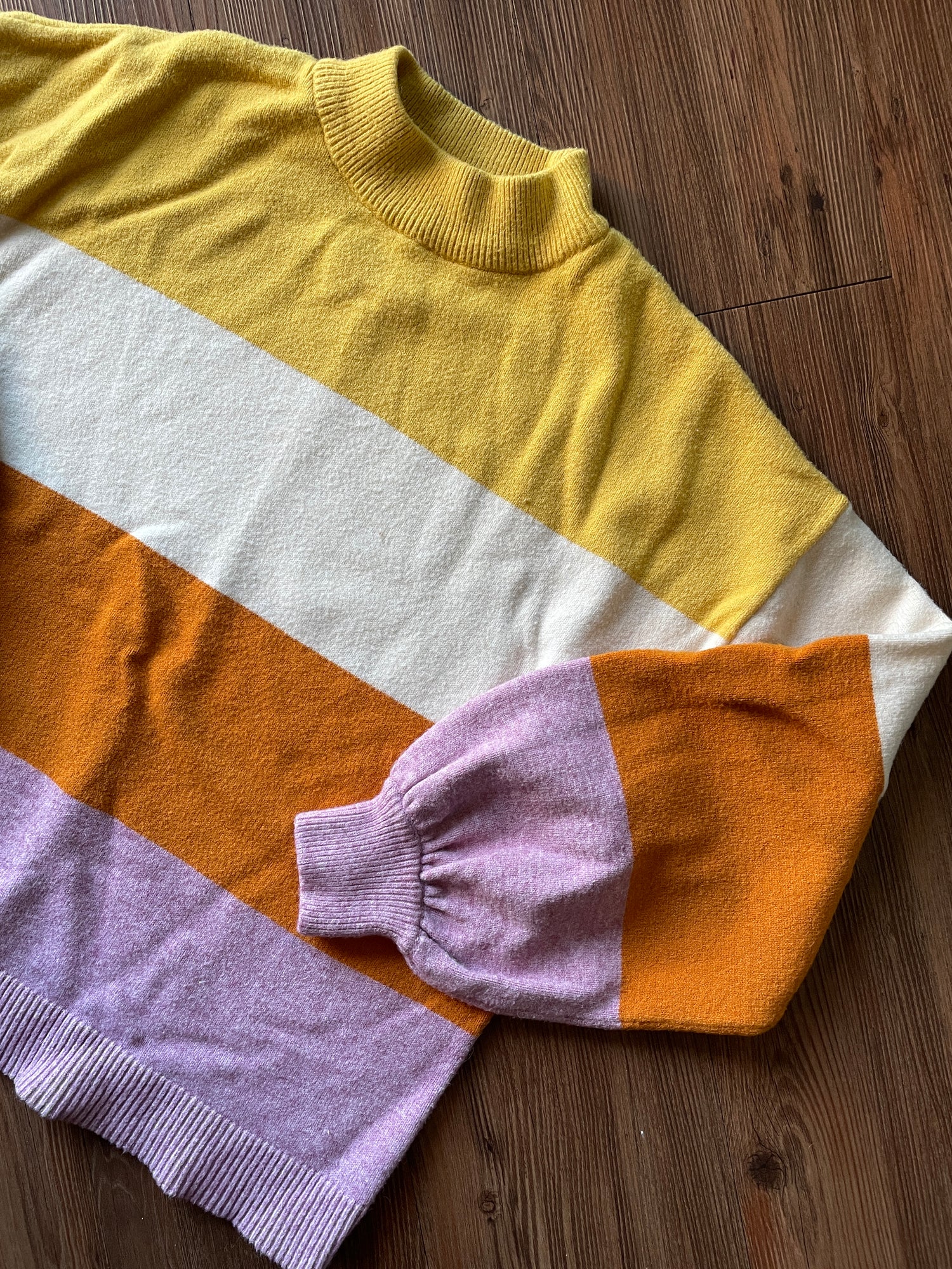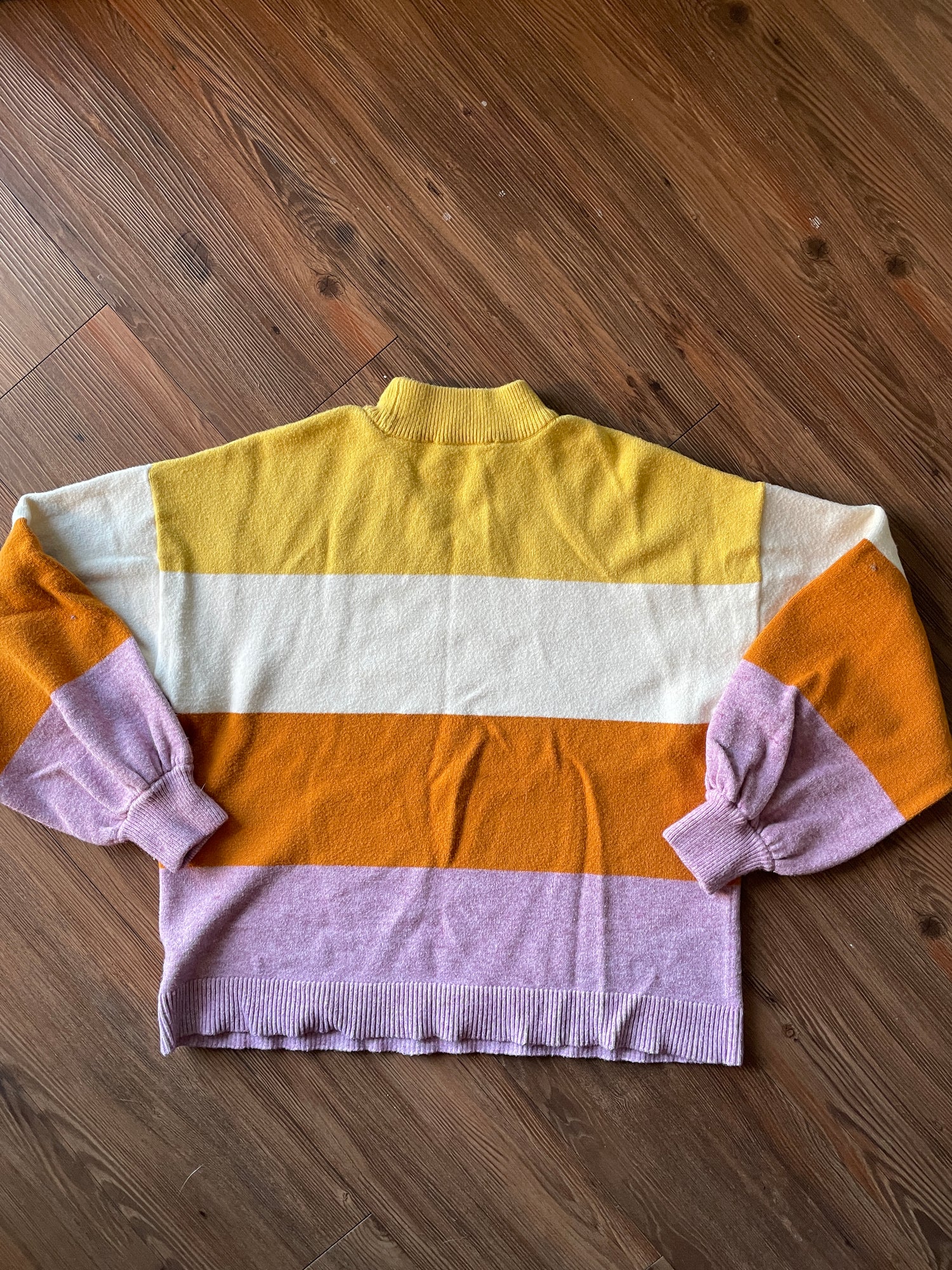 Fun floral print sweater from Nordstrom circa 2019. Sugar + Lips brand. Thick orange, white, yellow, and pink stripes combine with a mockneck and long puff sleeves for a sophisticated yet playful look. Slightly oversized fit goes great with leggings or jeans.