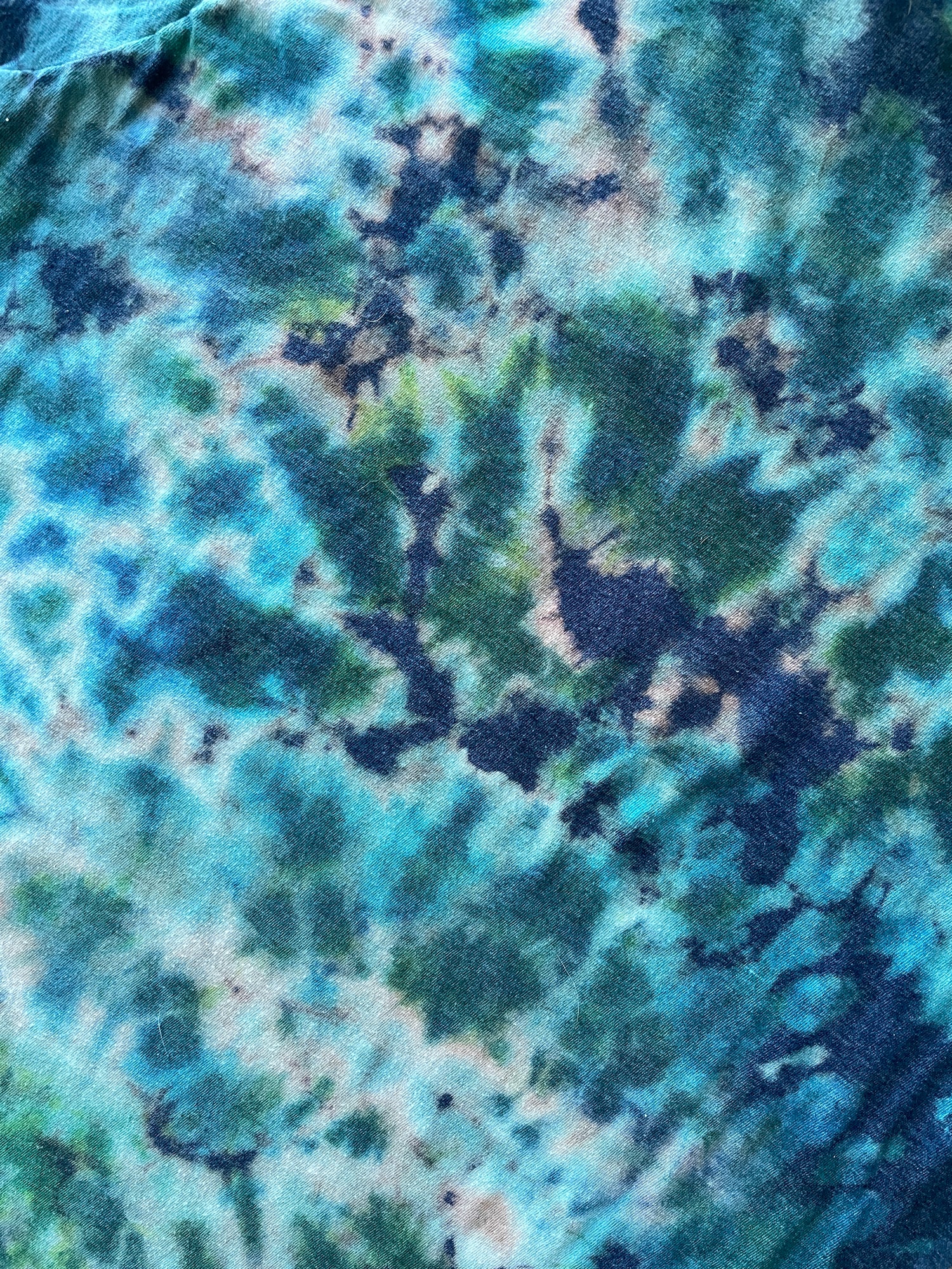 blue tshirt bleached and dyed with blue and green crumpled tie dye pattern