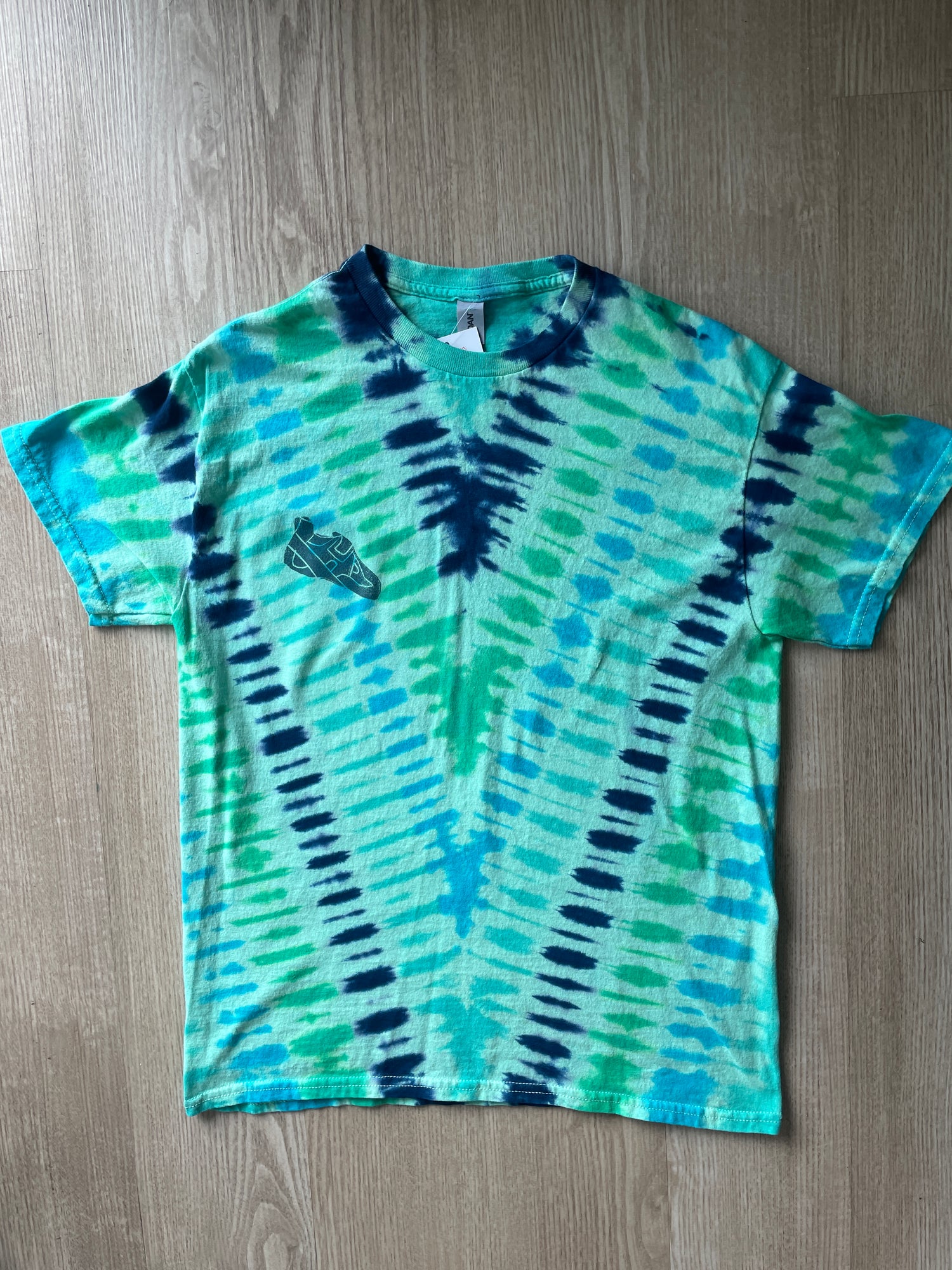 MEDIUM Men’s Climbing Shoe Handmade Tie Dyed T-Shirt | One-Of-a-Kind Green and Blue Pleated Short Sleeve