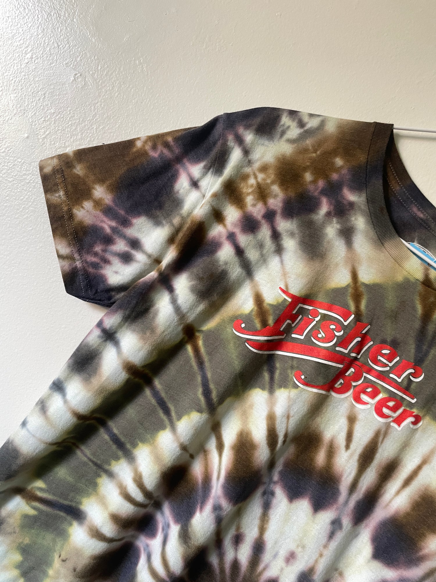 Medium Men’s Fisher Beer Handmade Reverse Tie Dye Short Sleeve T-Shirt | One-Of-a-Kind Upcycled Black and Rainbow Tie Dye Top