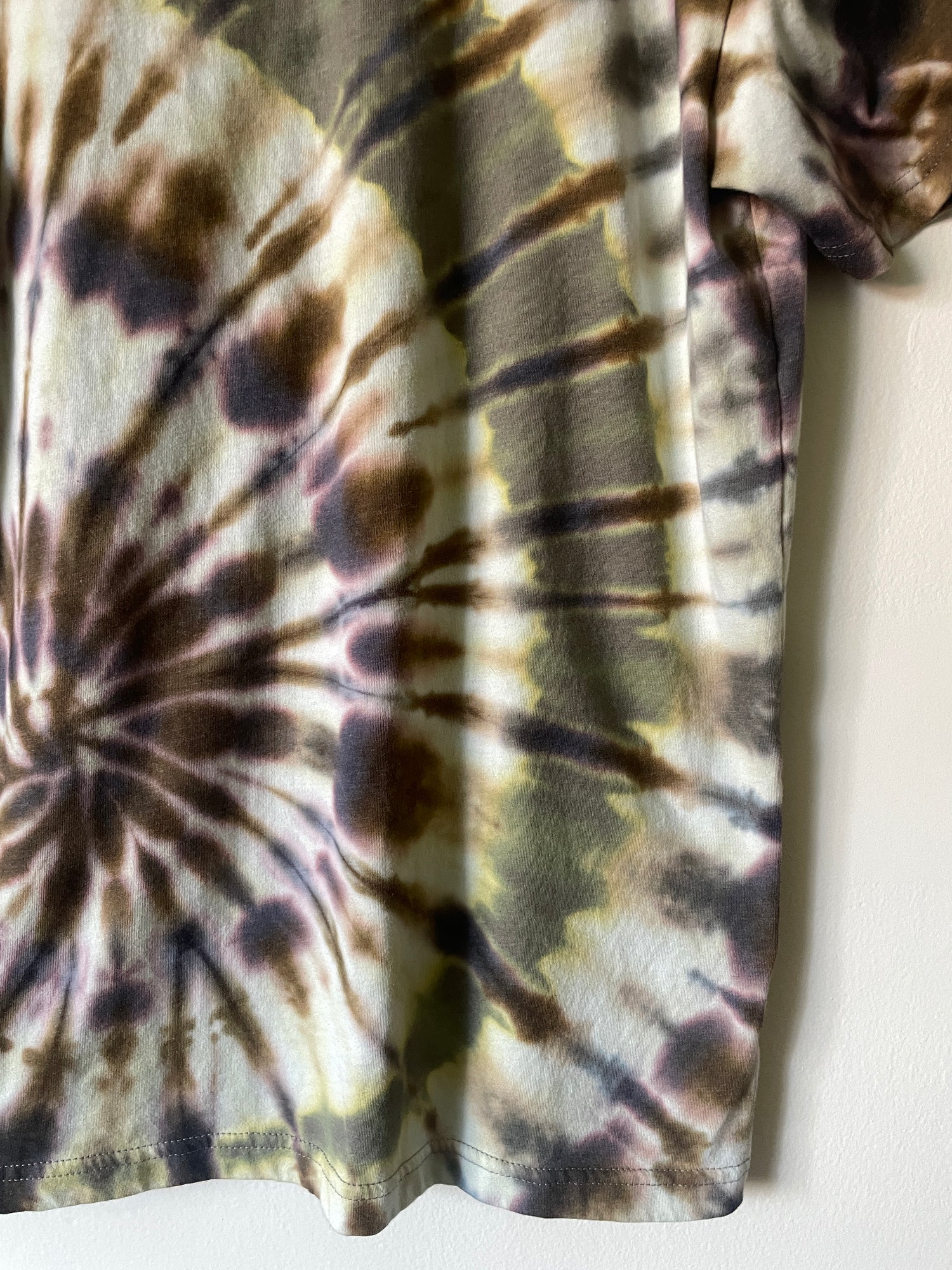 tan tshirt bleached and dyed with shades of yellow and brown spiral tie dye pattern
