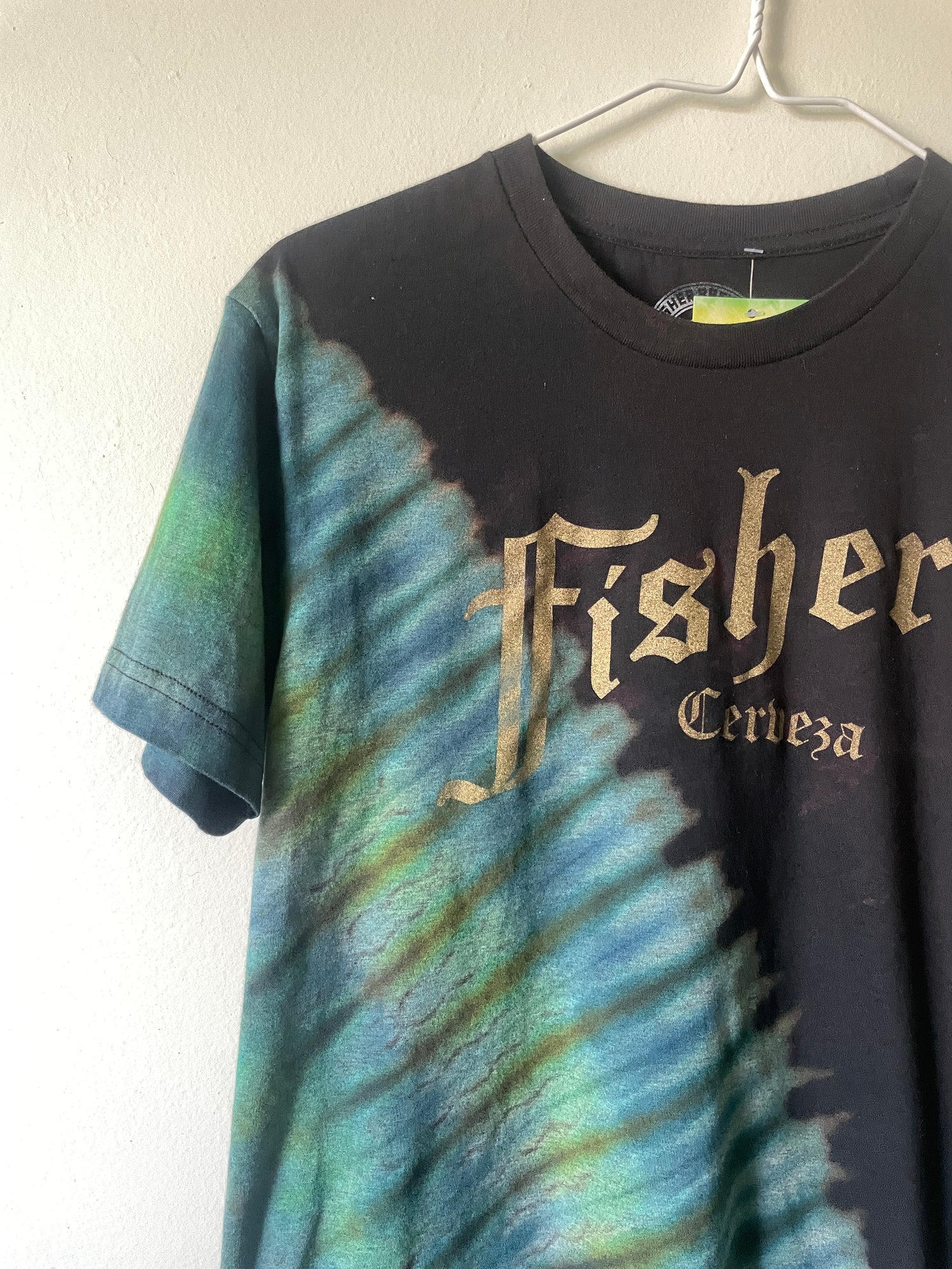 Small Men’s Fisher Cerveza Handmade Reverse Tie Dye Short Sleeve T-Shirt | One-Of-a-Kind Upcycled Black, Blue, and Green Tie Dye Top