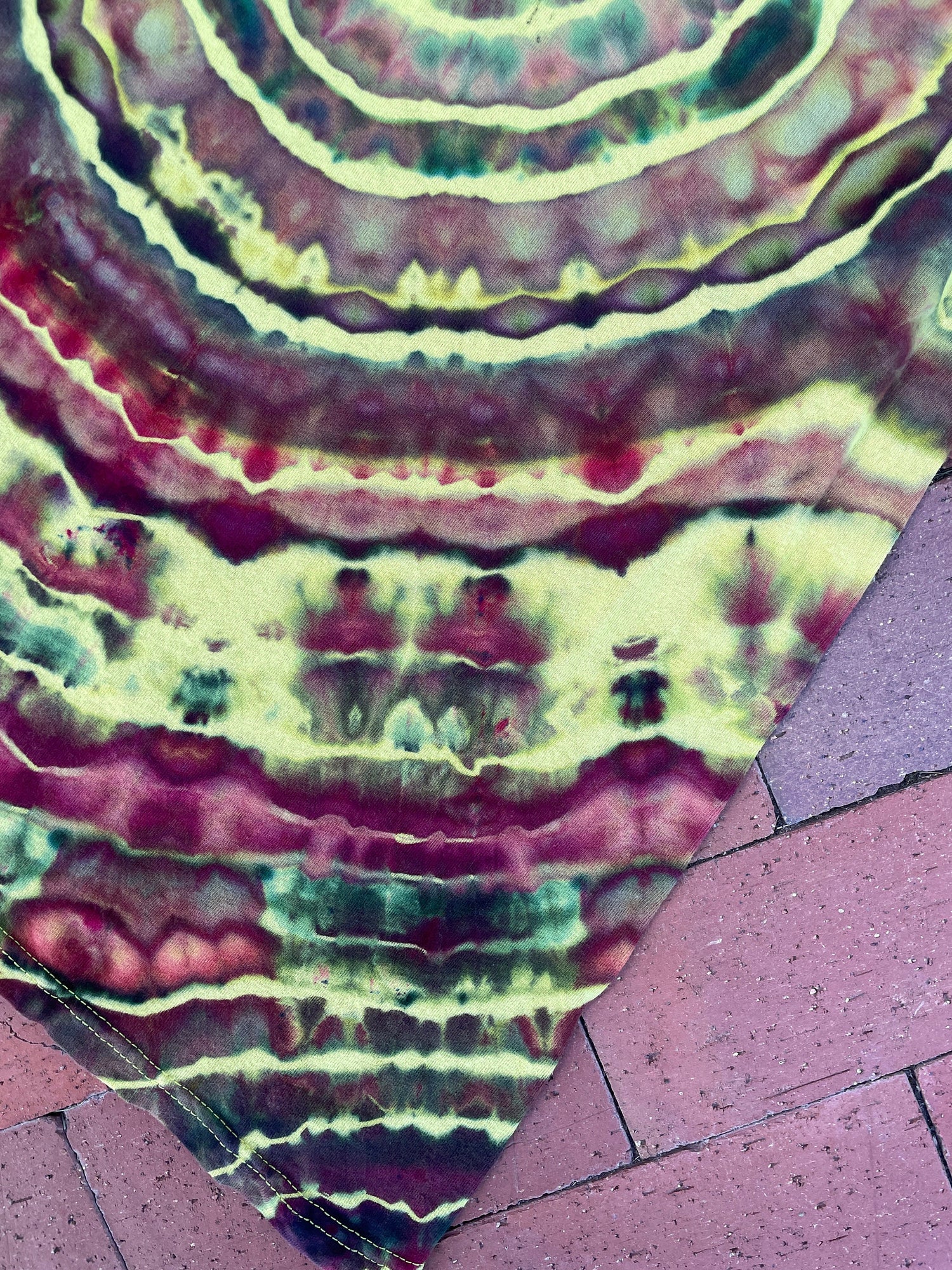 yellow tshirt dyed with shades of maroon and forest green geode tie dye pattern