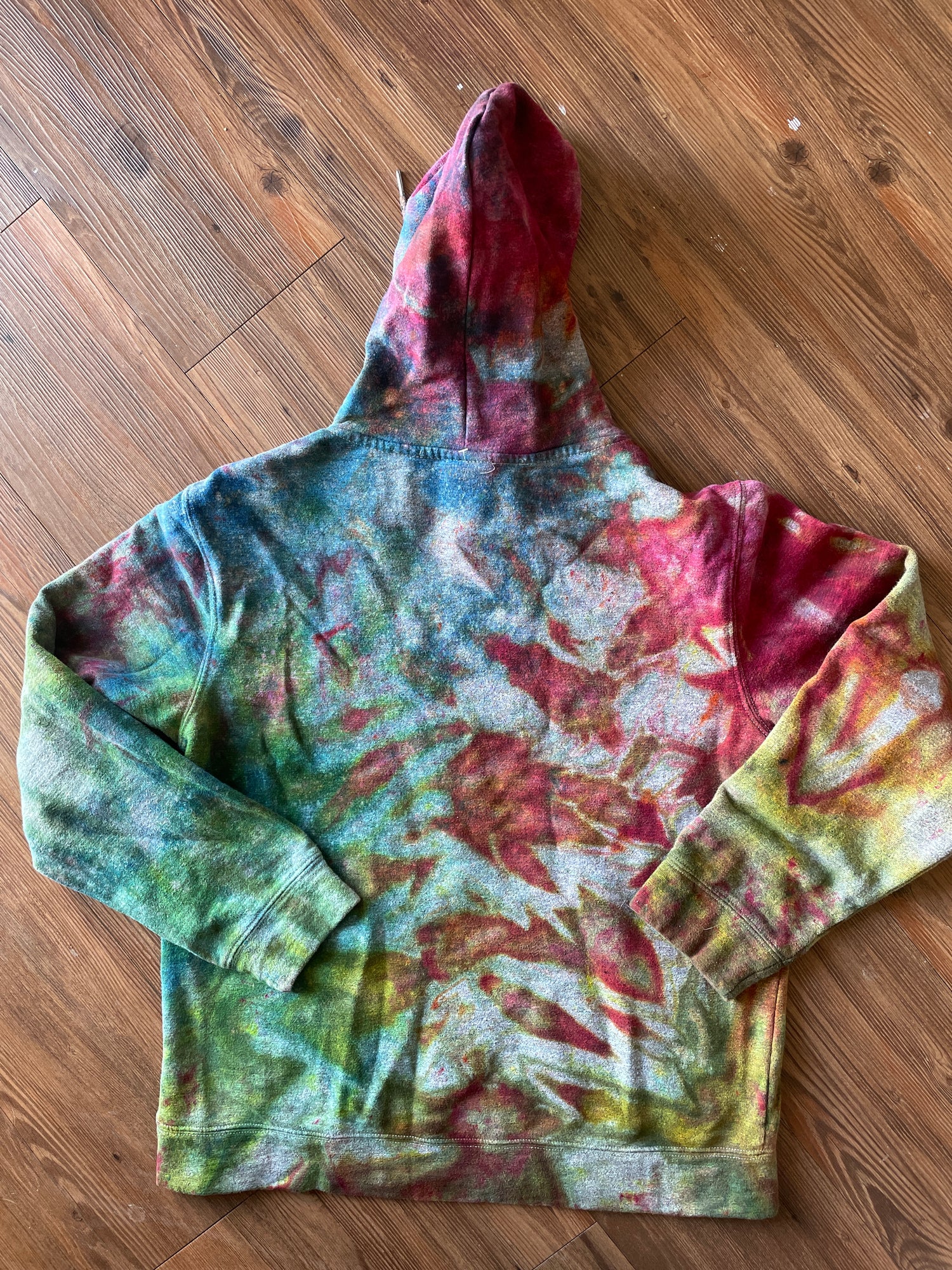 grey sweatshirt with red, yellow, green, and blue dye over ice for a galaxy effect