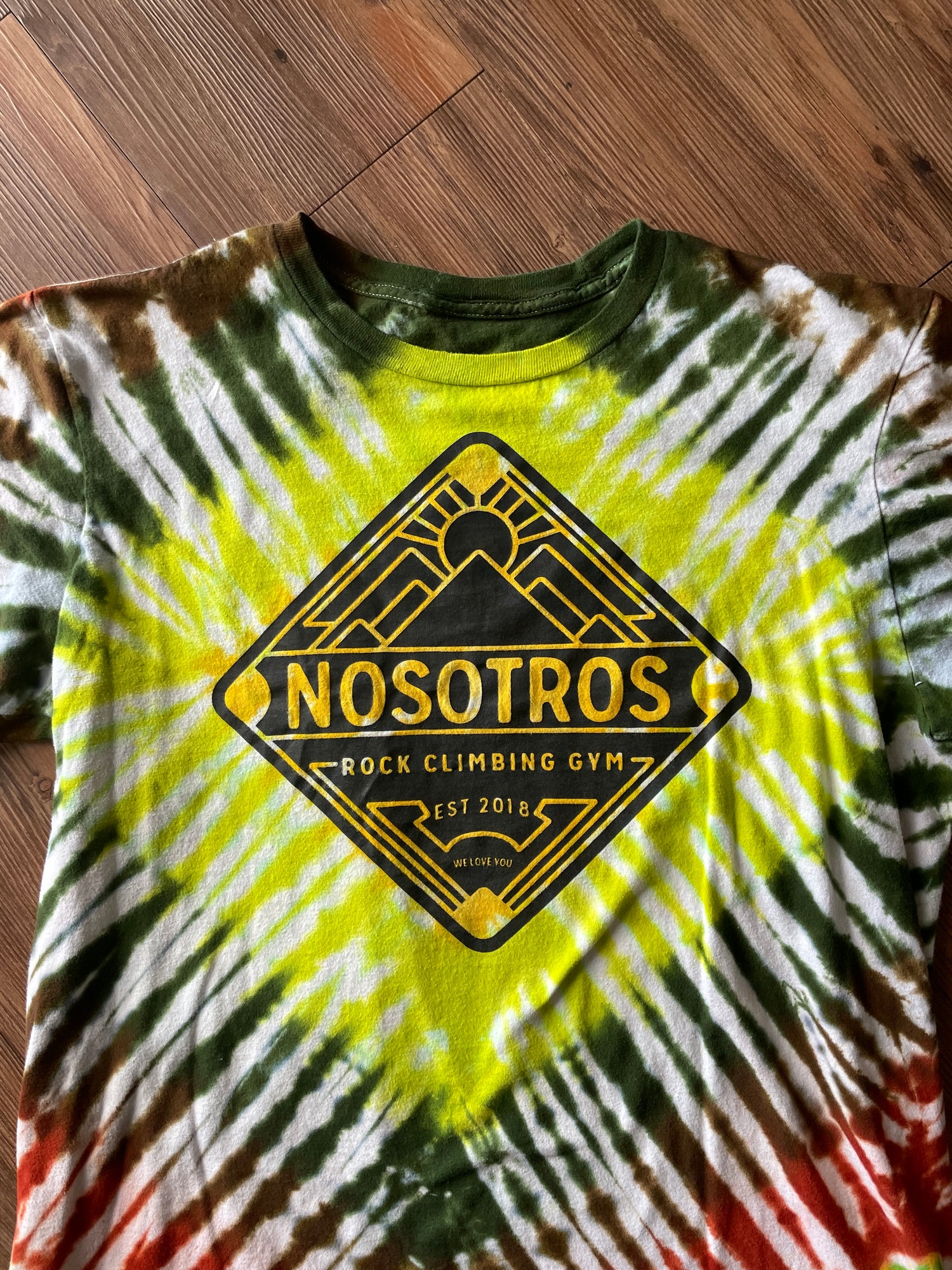 MEDIUM Men’s Nosotros Climbing Gym Tie Dye T-Shirt | Green, Yellow, and Brown Pleated Tie Dye Short Sleeve