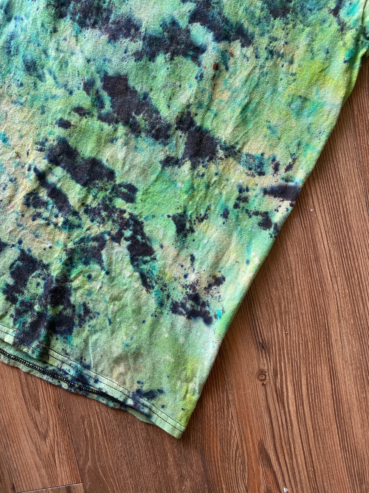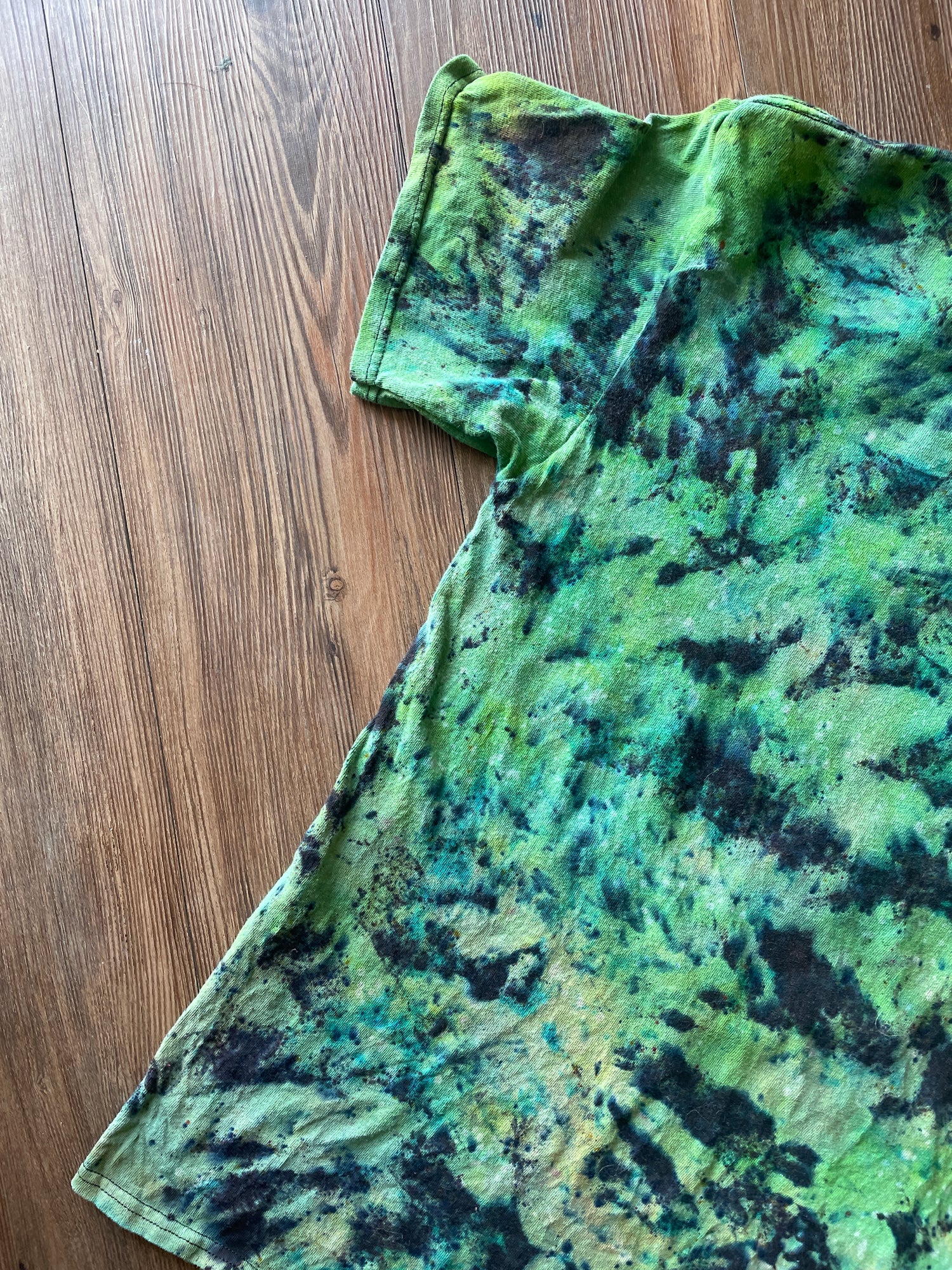 black tshirt bleached and dyed with green dye with no particular pattern in mind