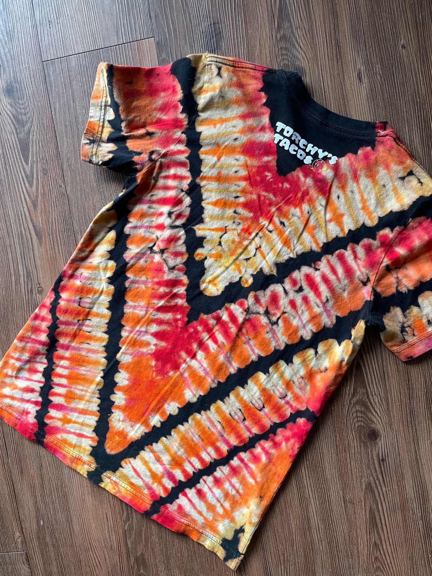 MEDIUM Men’s Show Me Your Taco Handmade Reverse Tie Dye T-Shirt | Black, Red, and Orange V-Pleated Short Sleeve