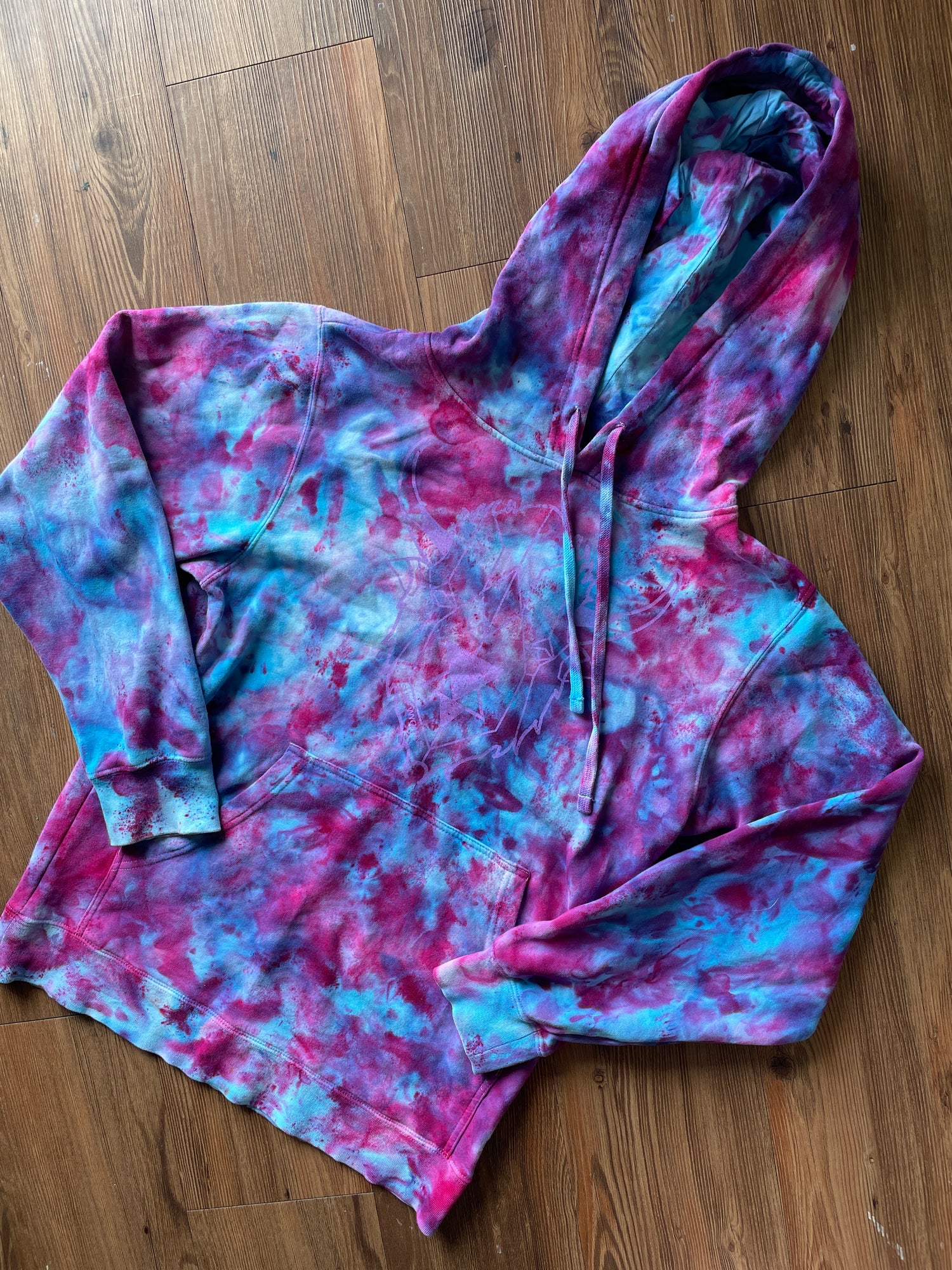 white hoodie dyed with blue, purple, and pink dye over ice for a galaxy effect