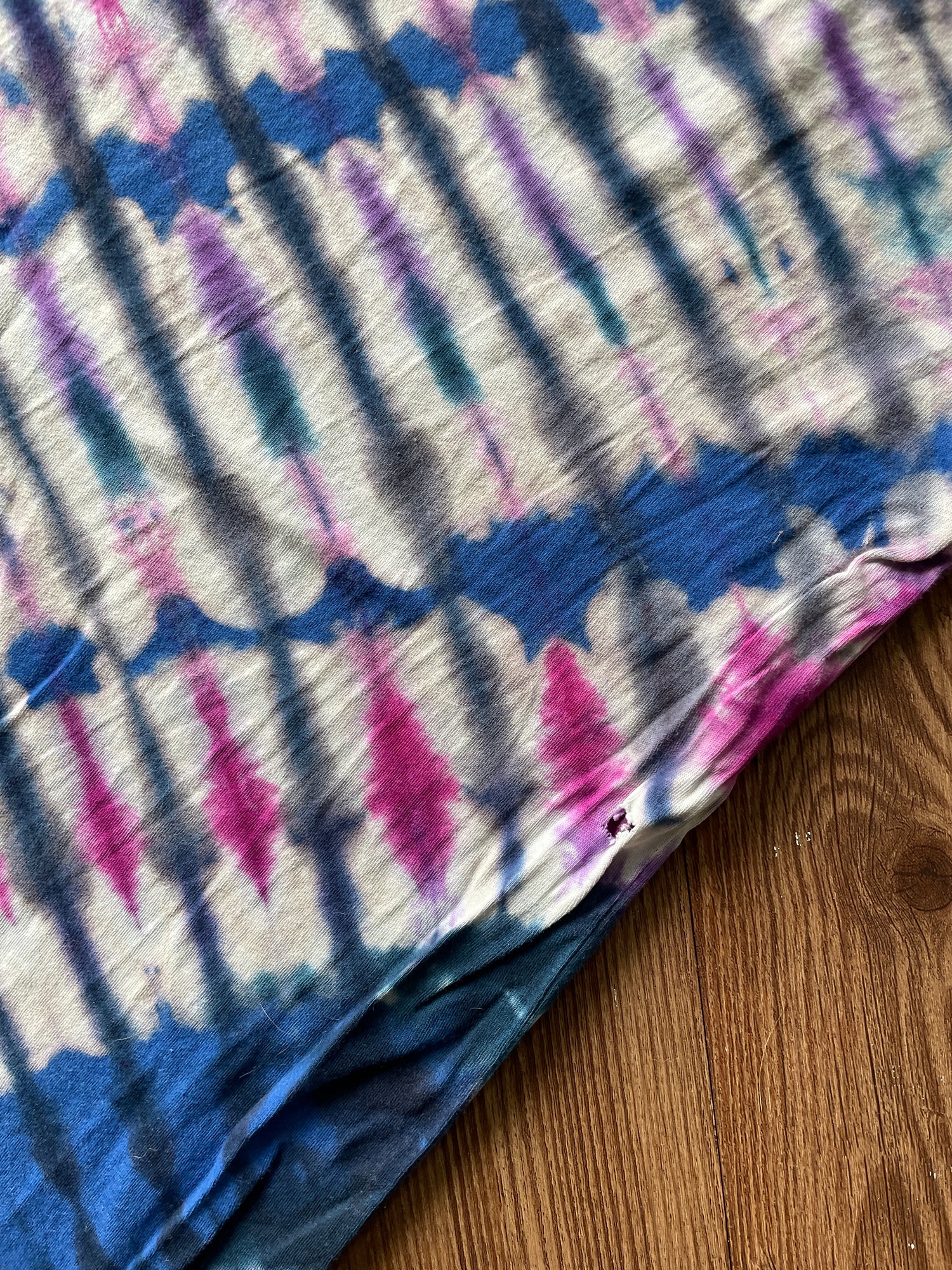 blue tshirt bleached and dyed with purple and black pleated tie dye pattern