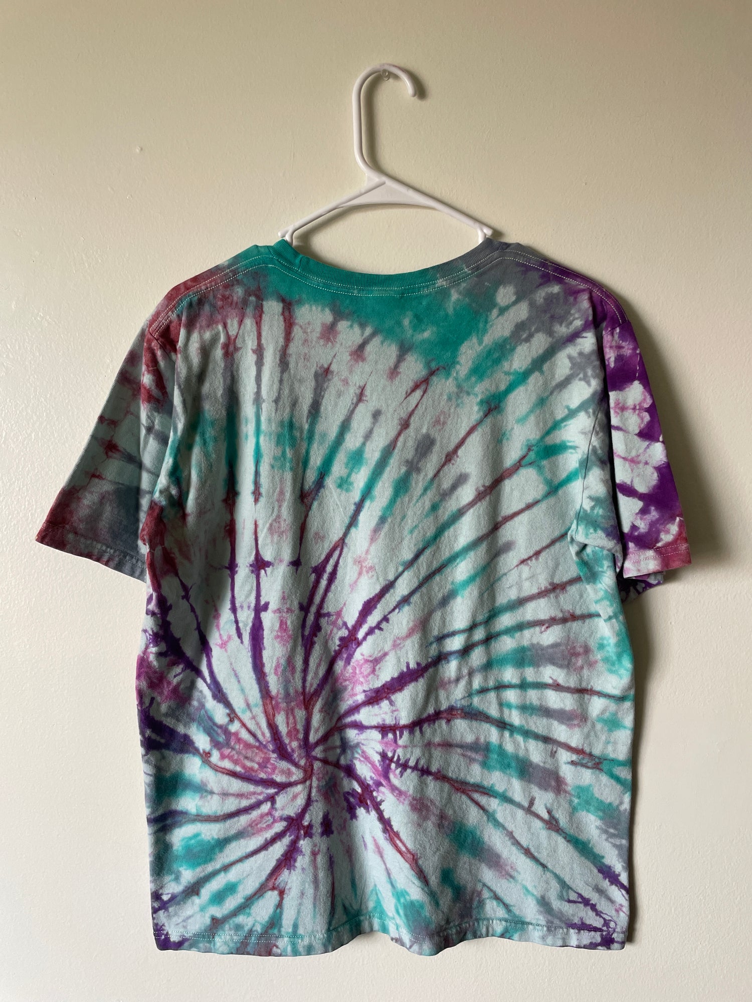 white tshirt dyed with pink, teal, and purple spiral tie dye pattern