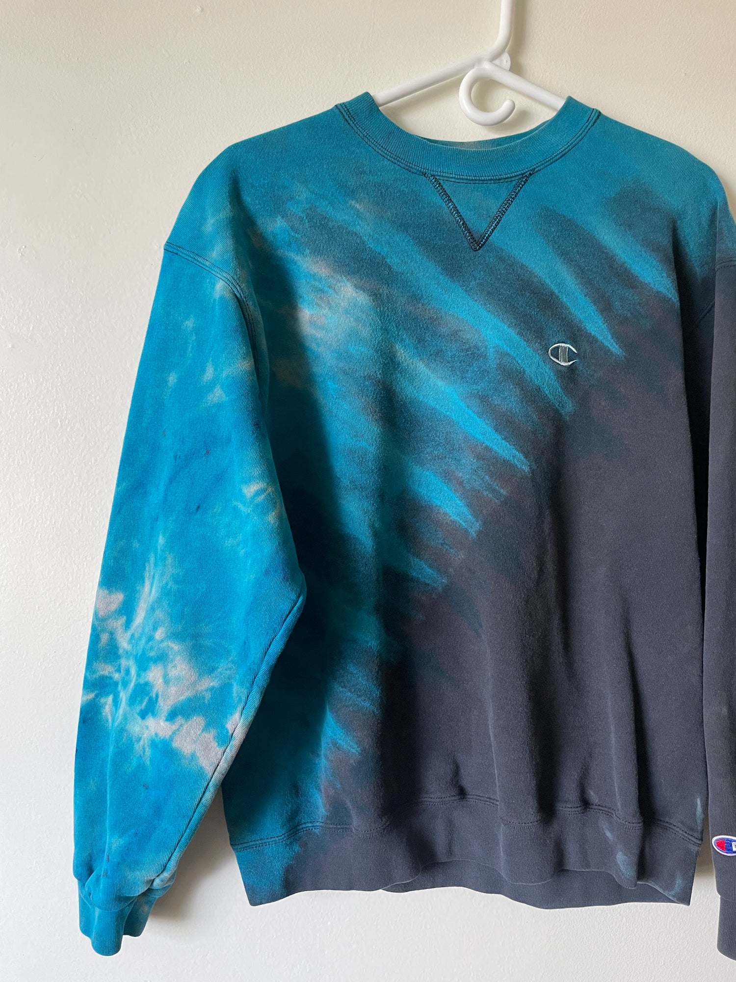 Large Men's Champion Reverse Tie Dye Long Sleeve Crewneck Sweatshirt | One-Of-a-Kind Upcycled Black and Blue Half-and-Half Sweatshirt