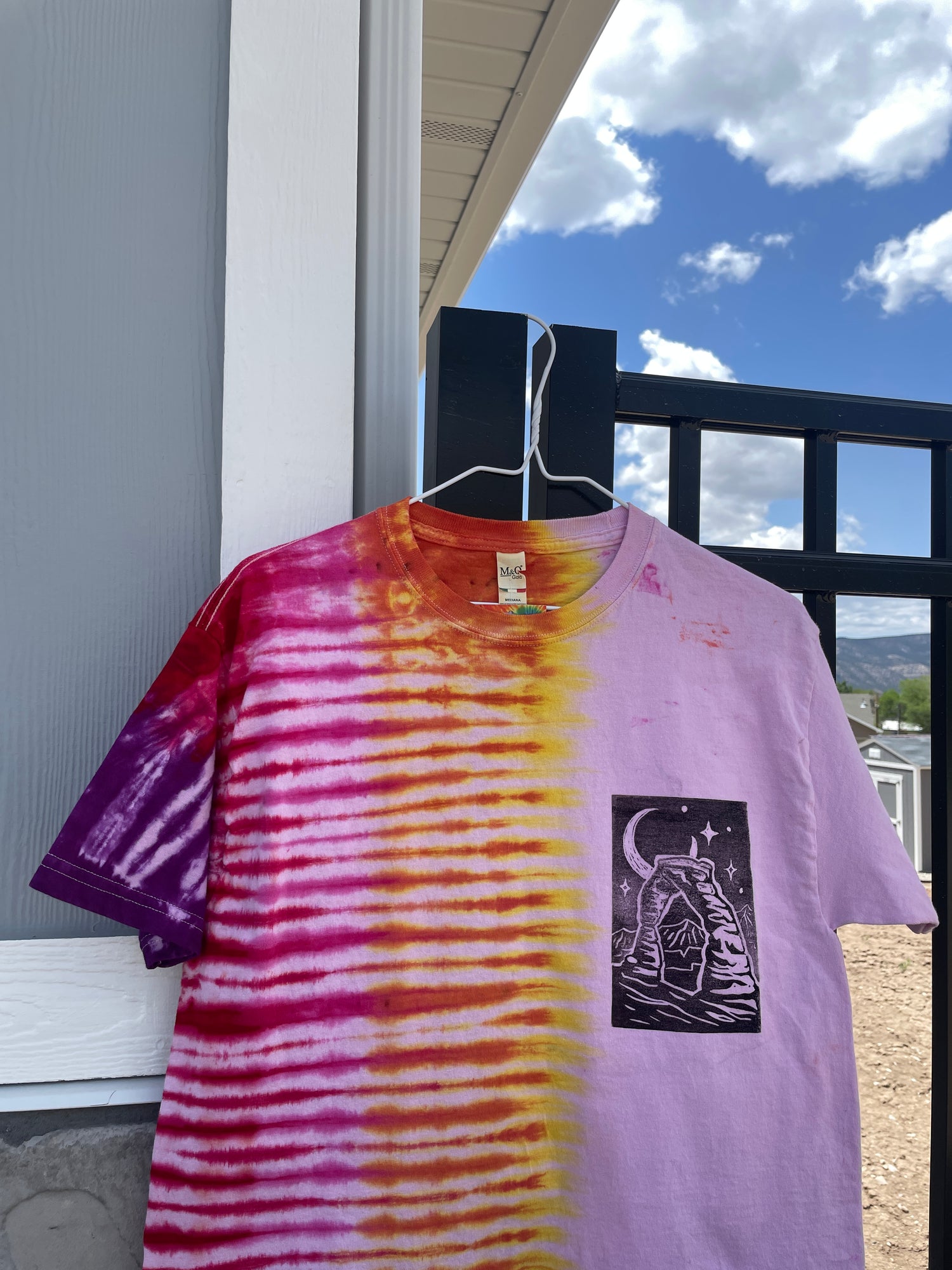 Medium Men's Delicate Arch Moab Utah Handmade Tie Dye Block-Printed T-Shirt | One-Of-a-Kind Upcycled Pink and Orange Desert Sunset Short Sleeve Shirt