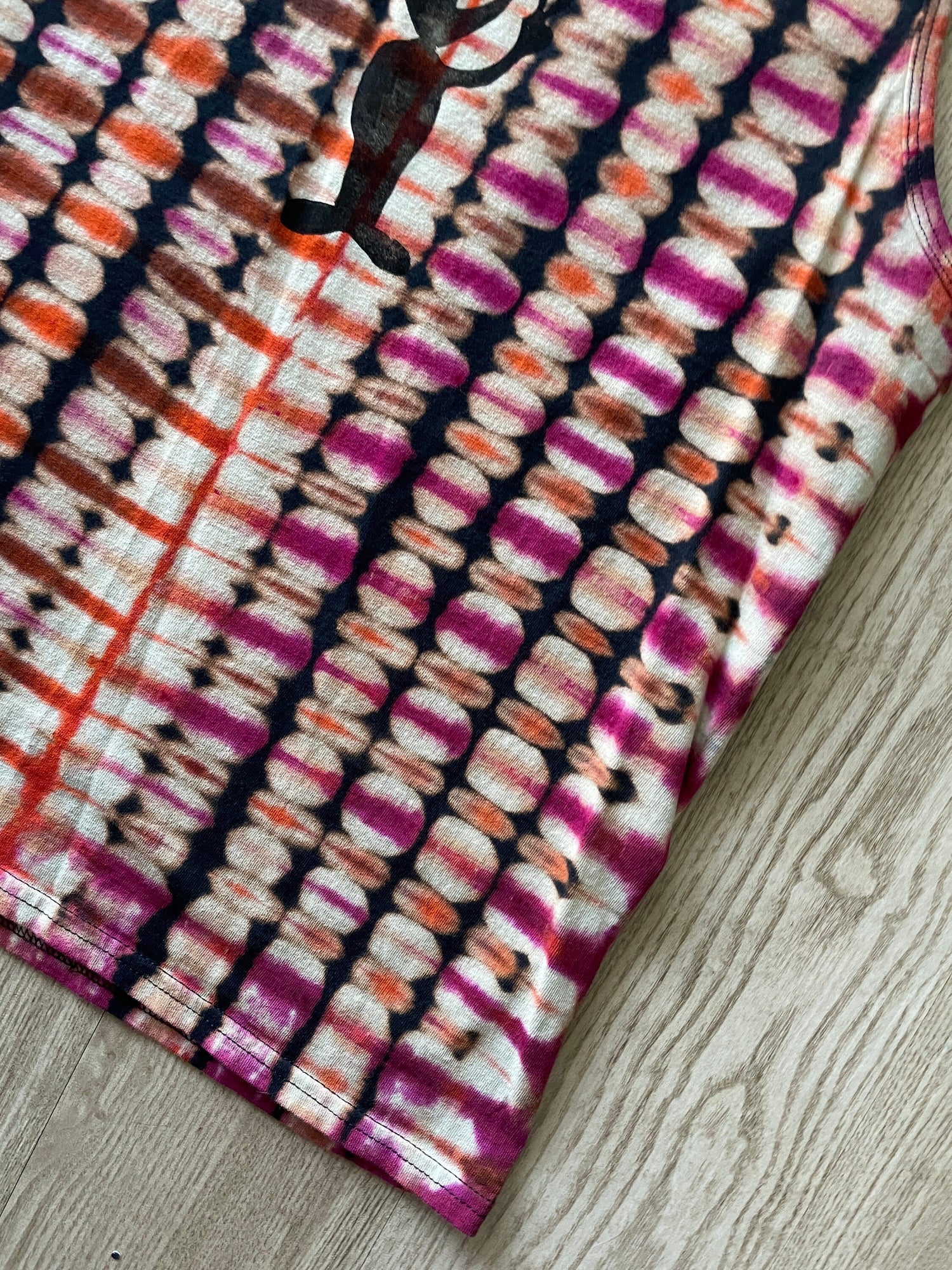black shirt bleachd and dyed with shades of orange and pink pleated tie dye pattern
