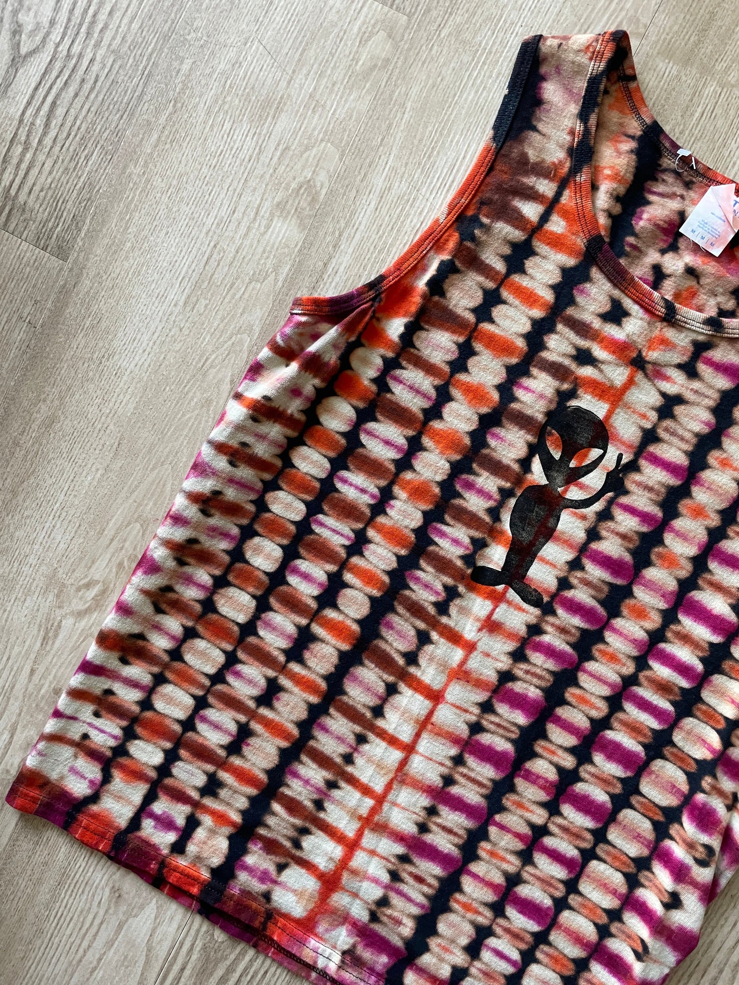 Medium Men's Hand-Printed Alien Reverse Tie Dye Tank Top | Handmade One-Of-a-Kind Upcycled Black, Orange, and Pink Sleeveless Top