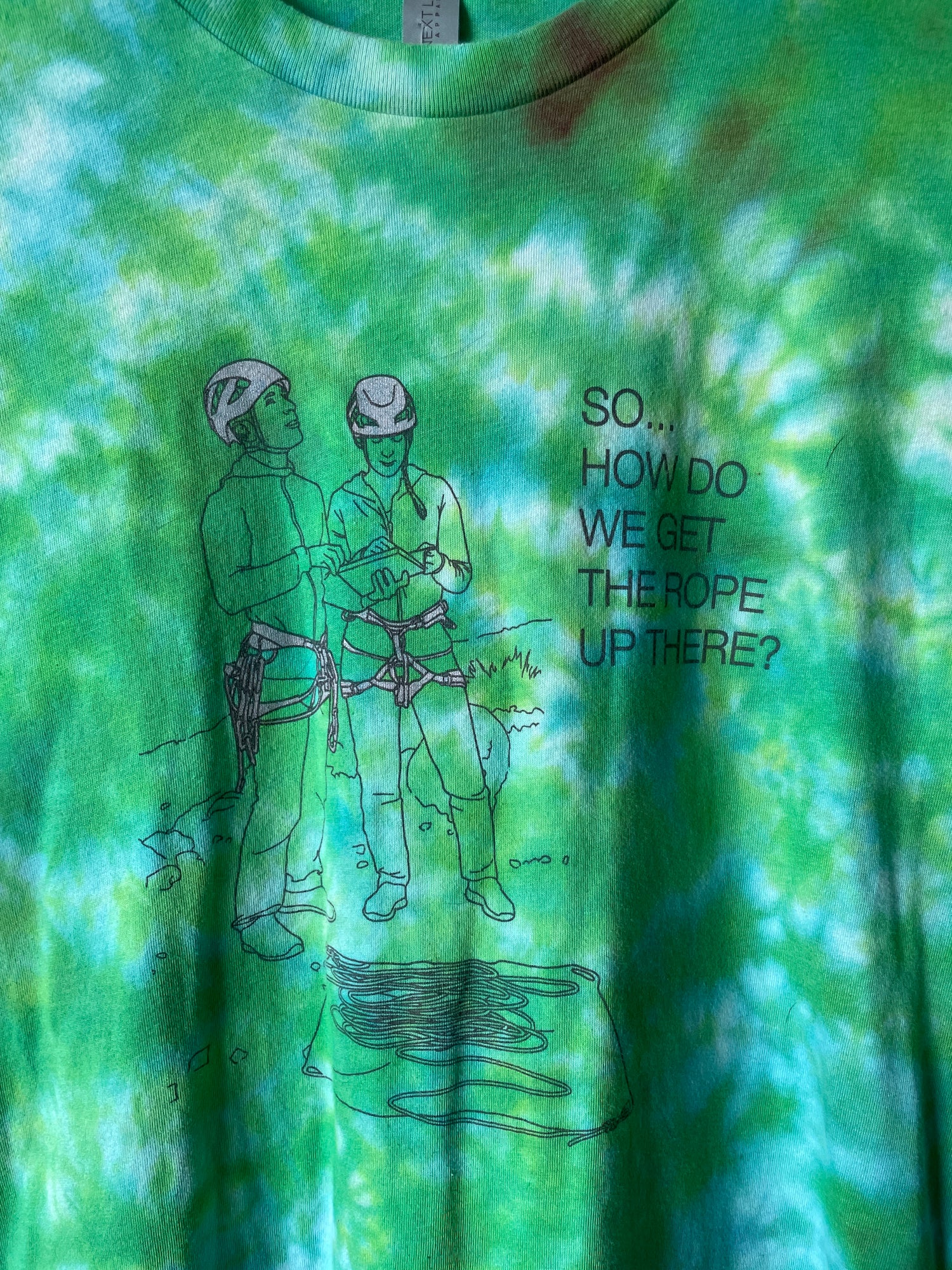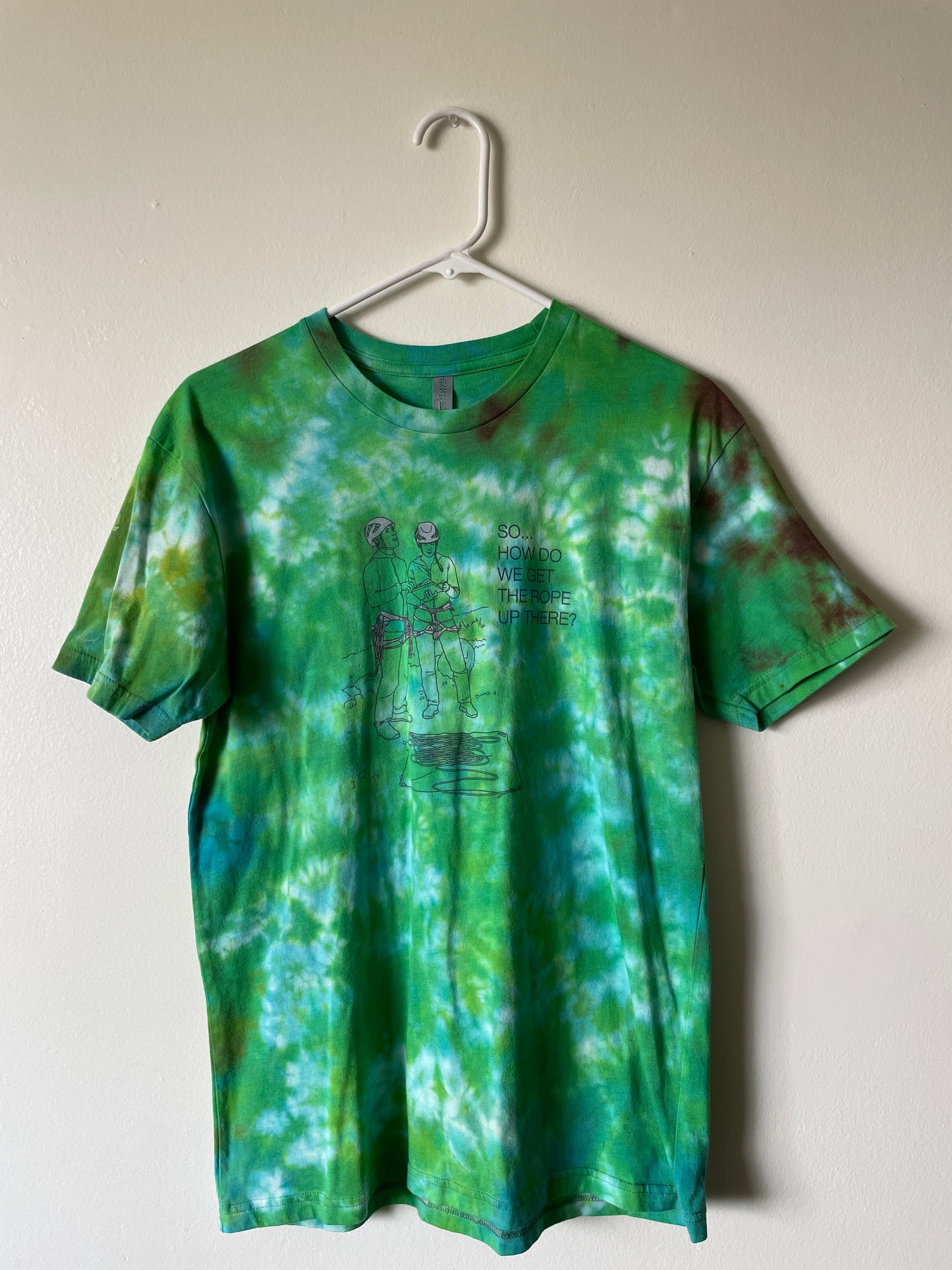 Medium Men's How Do We Get the Rope Up There? Rock Climbing Handmade Tie Dye Short Sleeve T-Shirt | One-Of-a-Kind Upcycled Green and White Tie Dye Top