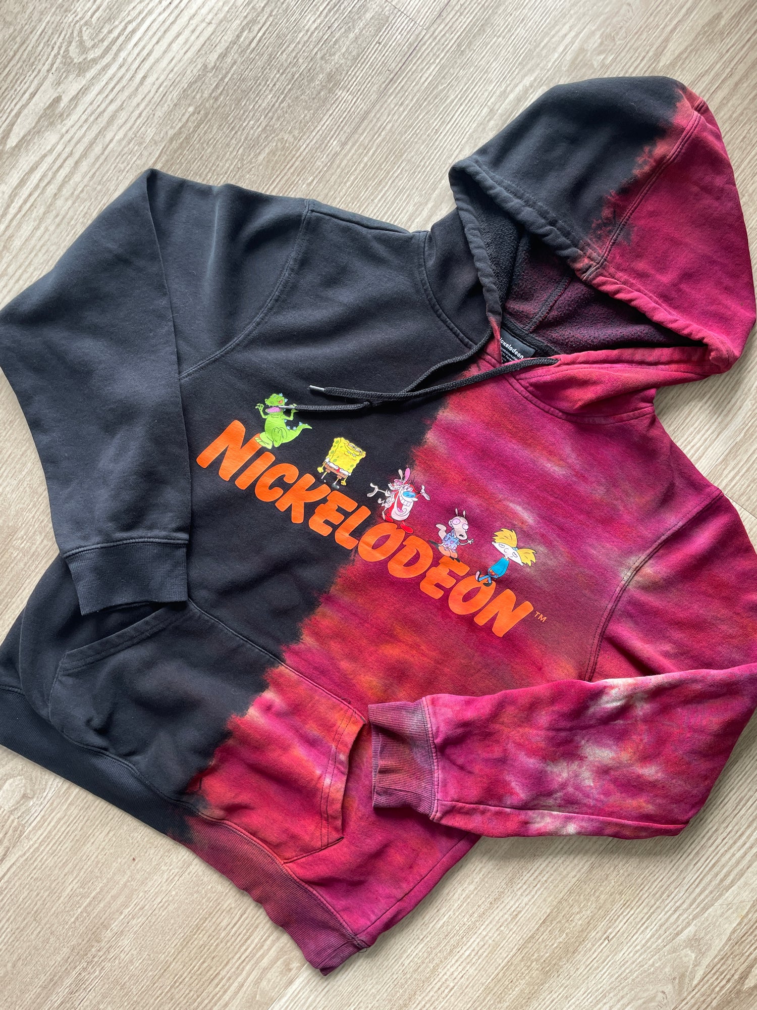 Medium Men's NICKELODEON Reverse Tie Dye Hoodie | One-Of-a-Kind Upcycled Black and Red Half-and-Half Sweatshirt
