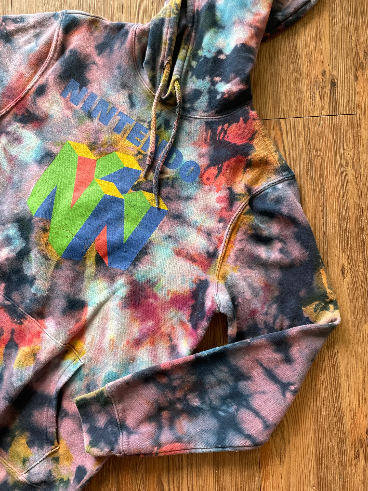 MEDIUM (Tall) Men’s Nintendo 64 Handmade Tie Dye Hoodie | Navy Blue, Red, and Green Crumpled Bleach Dye Long Sleeve Sweatshirt