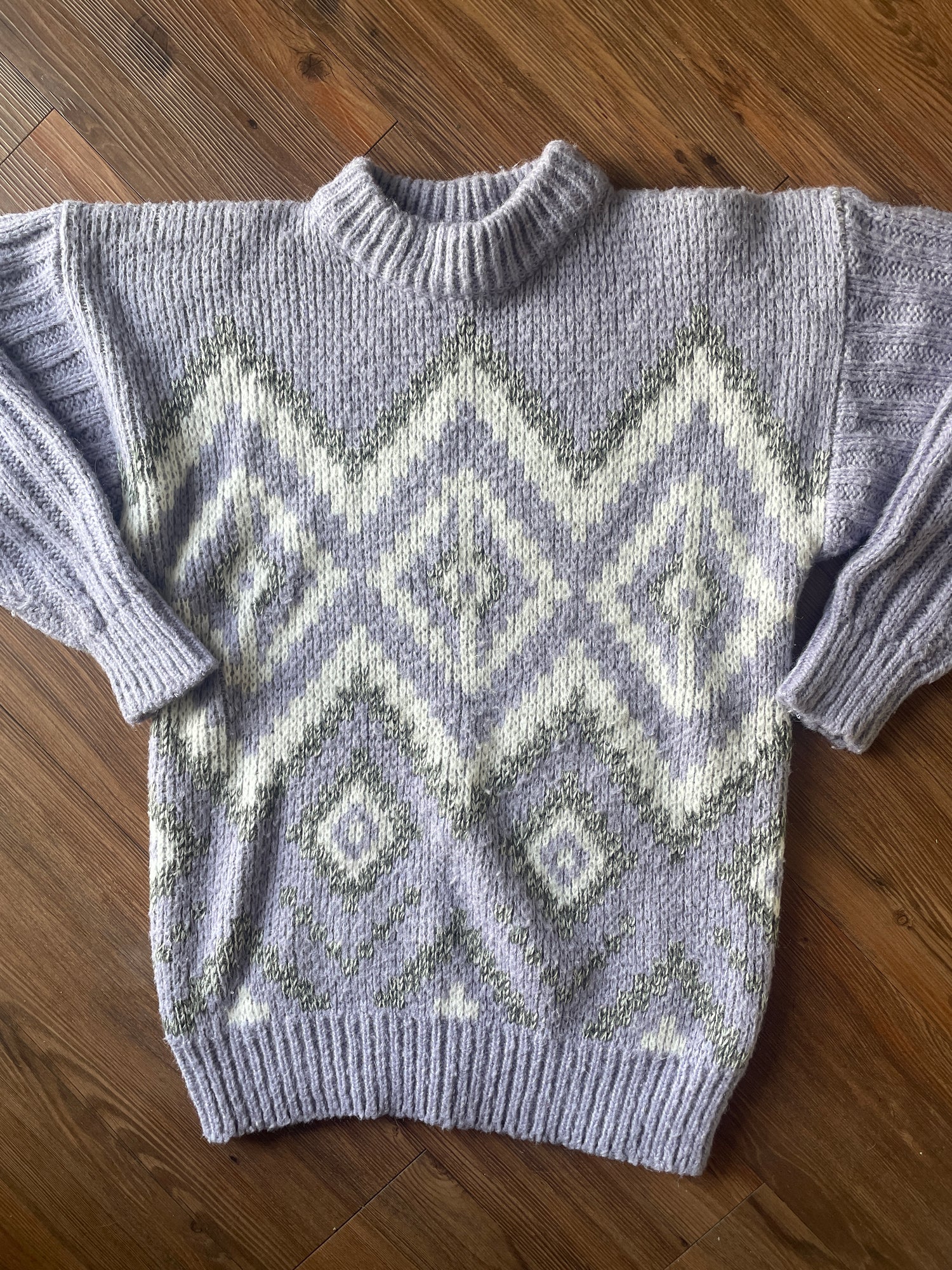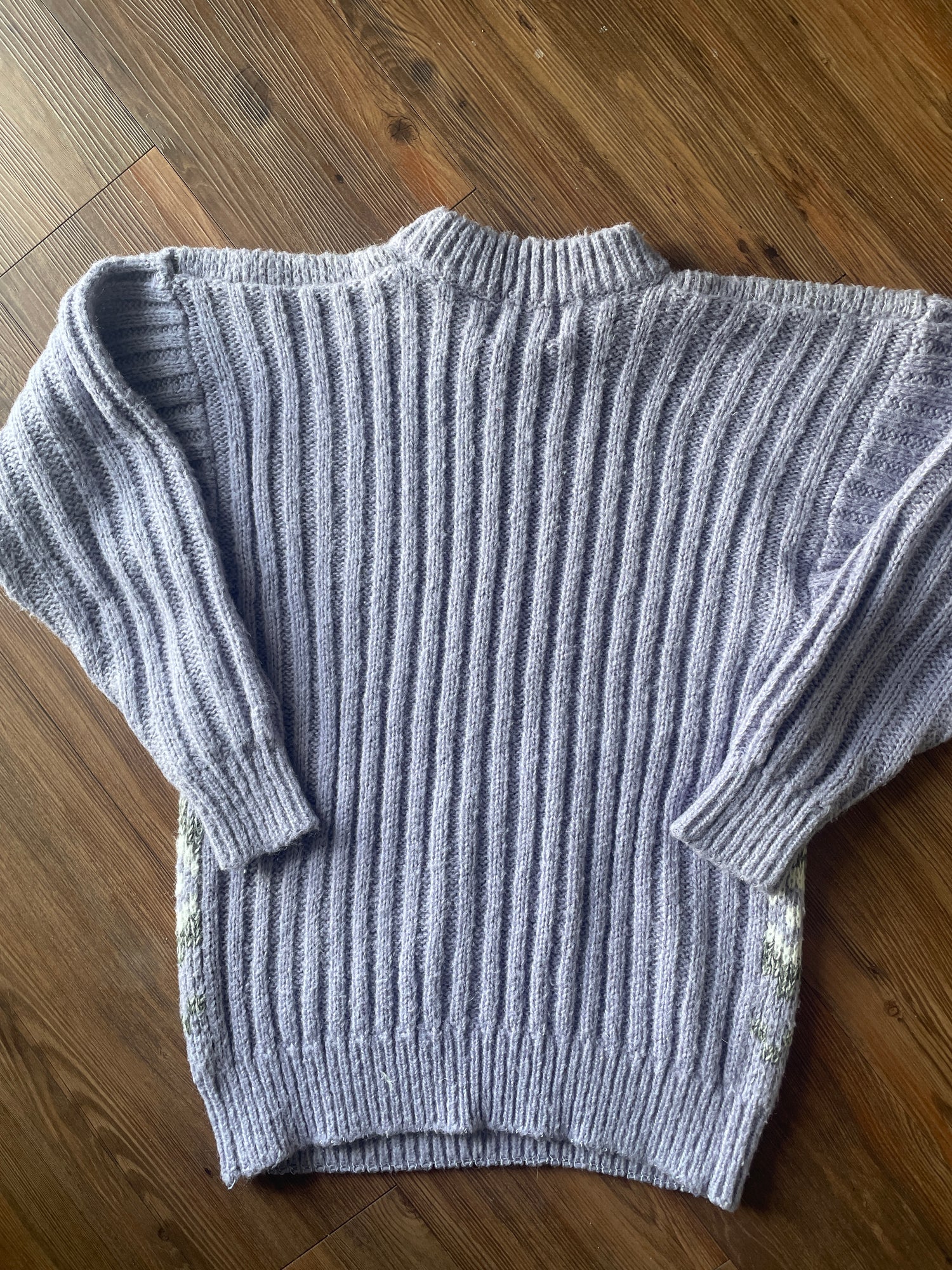 Super oversized 80s sweater. Chunky fabric is super warm, vertical knit pattern on sleeves and back is both flattering and comfy as f*ck. Unique pastel purple body with gray and white chevron pattern.