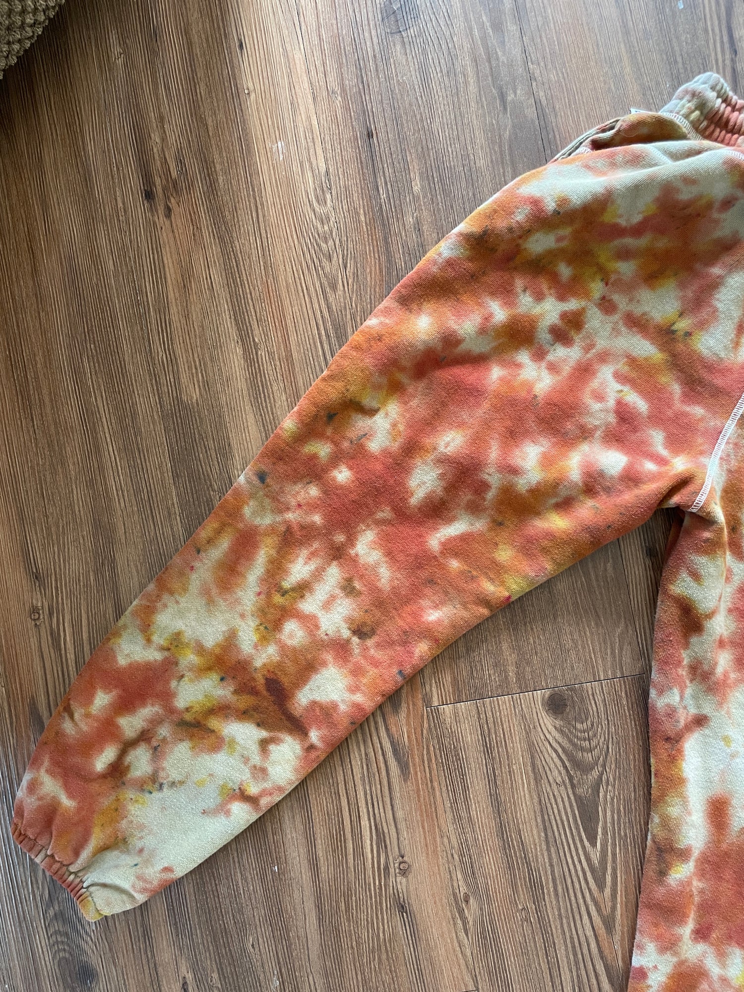 green sweatpants dyed with shades of orange and yellow crumpled tie dye pattern