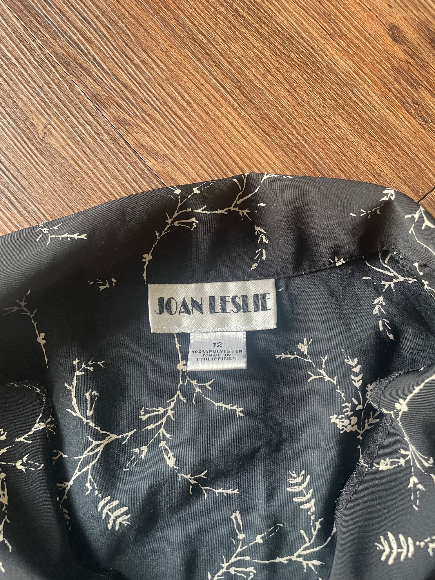 Gorgeous black and white vintage top from Joan Leslie. Silky black body with understated white floral print throughout. Tuck into jeans, tie the ends, or wear open. Super versatile!