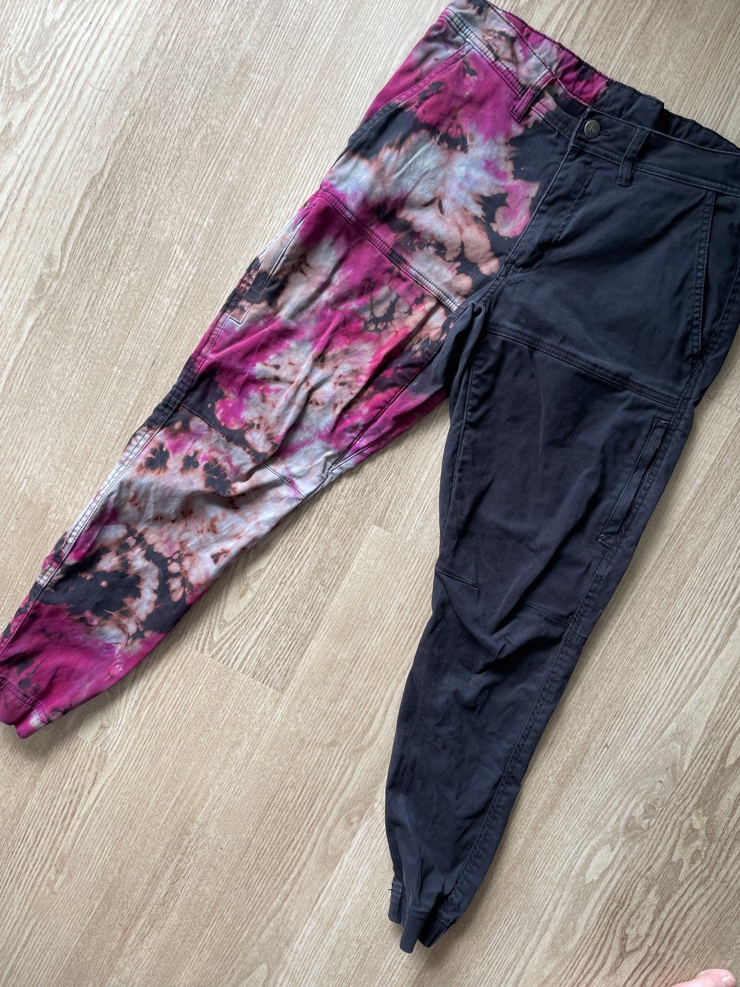black pants bleached and dyed with shades of pink crumpled tie dye pattern on one leg